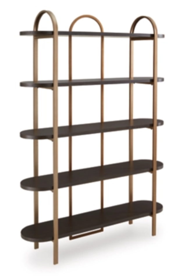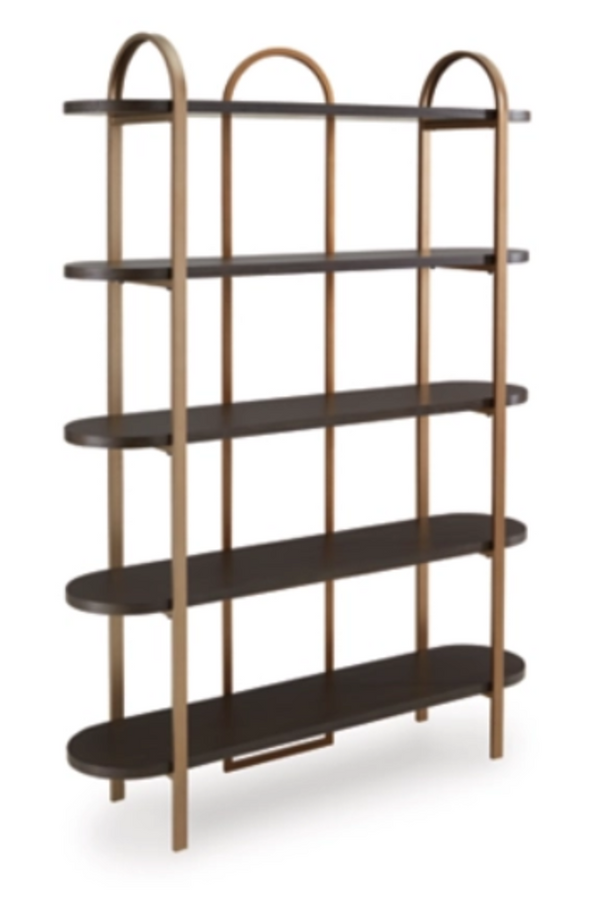 With its mixed-material look, this bookcase seamlessly fits into a wide range of modern settings. Five fixed display shelves in a dark brown finish are balanced by sleek antiqued goldtone metal supports. Offering storage and superior style for books or showcasing decor, this bookcase is a masterful way to stay organized.