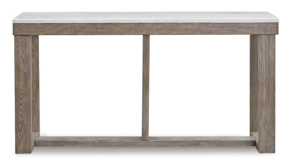 This sofa table is simple in design but big on style. Finished with a trend-right grayish brown wood tone, its bold, blocky profile and natural marble top are timeless, classic choices. This table is ideal for pairing with an ottoman to pull extra seating into the room, or for remaining clean and sleek on its own.