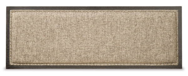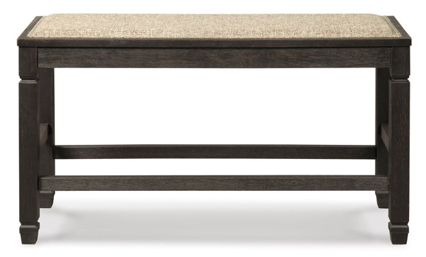 Invite your family into the heart of your home with the Tyler Creek upholstered dining room bench. Tapered legs are a sturdy foundation, while the counter-height design raises the bar on fine dining. Textured black finish and heavy woven neutral upholstery accented with silvertone nailhead trim is trend-right urban farmhouse style without all the fuss.