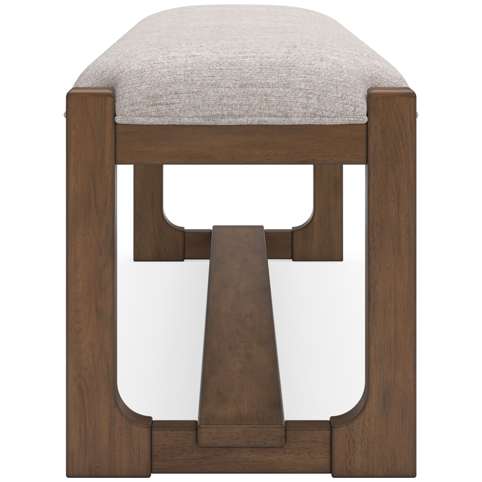 This dining bench sits comfortably at the intersection of modern lodge and farmhouse aesthetics. Your warm and welcoming disposition is reflected in its charming architectural elements and neutral textural fabric. Even with its poise, the bench remains practical. Its cushioned seat invites you to linger longer at the table, defining your dining room with reliable function and style.