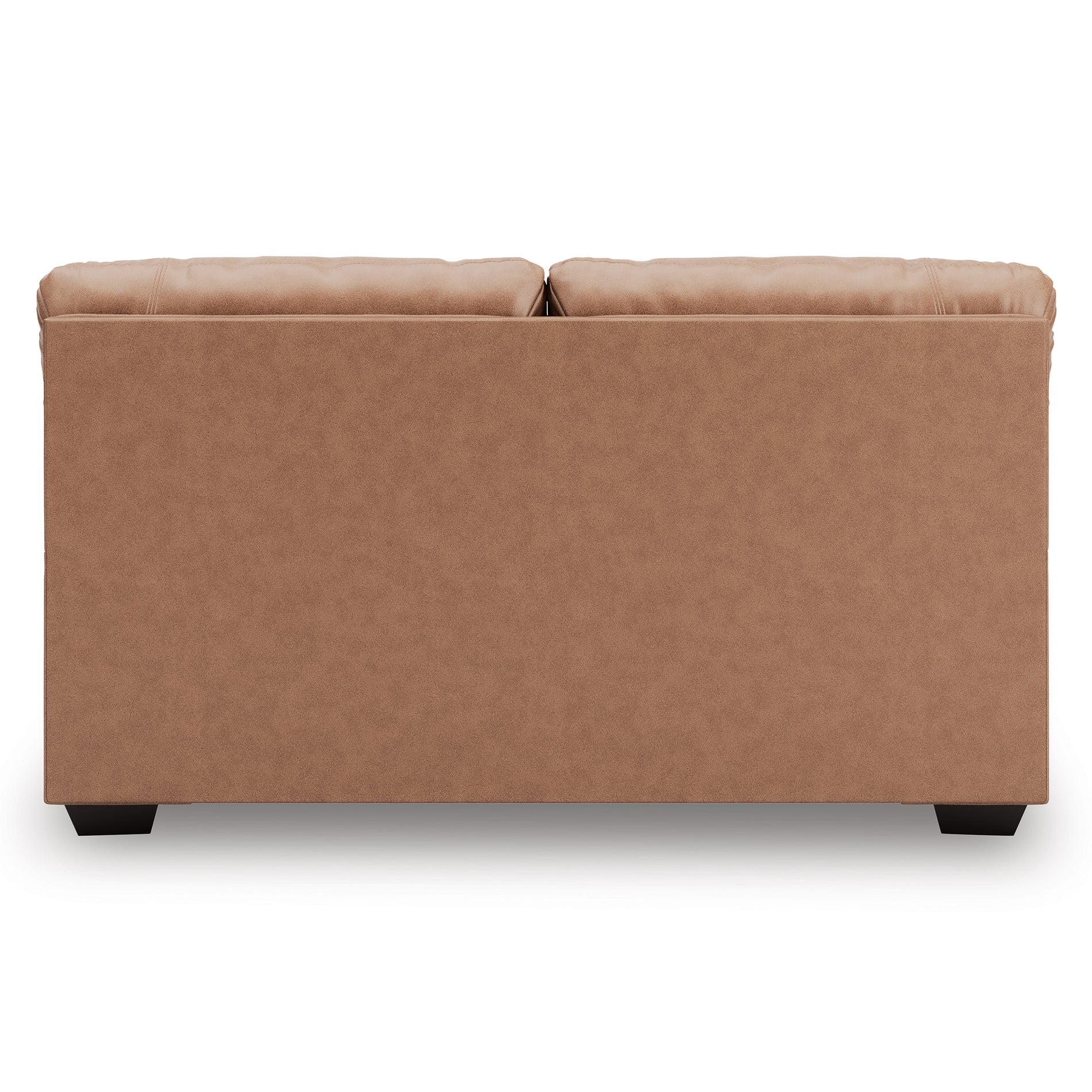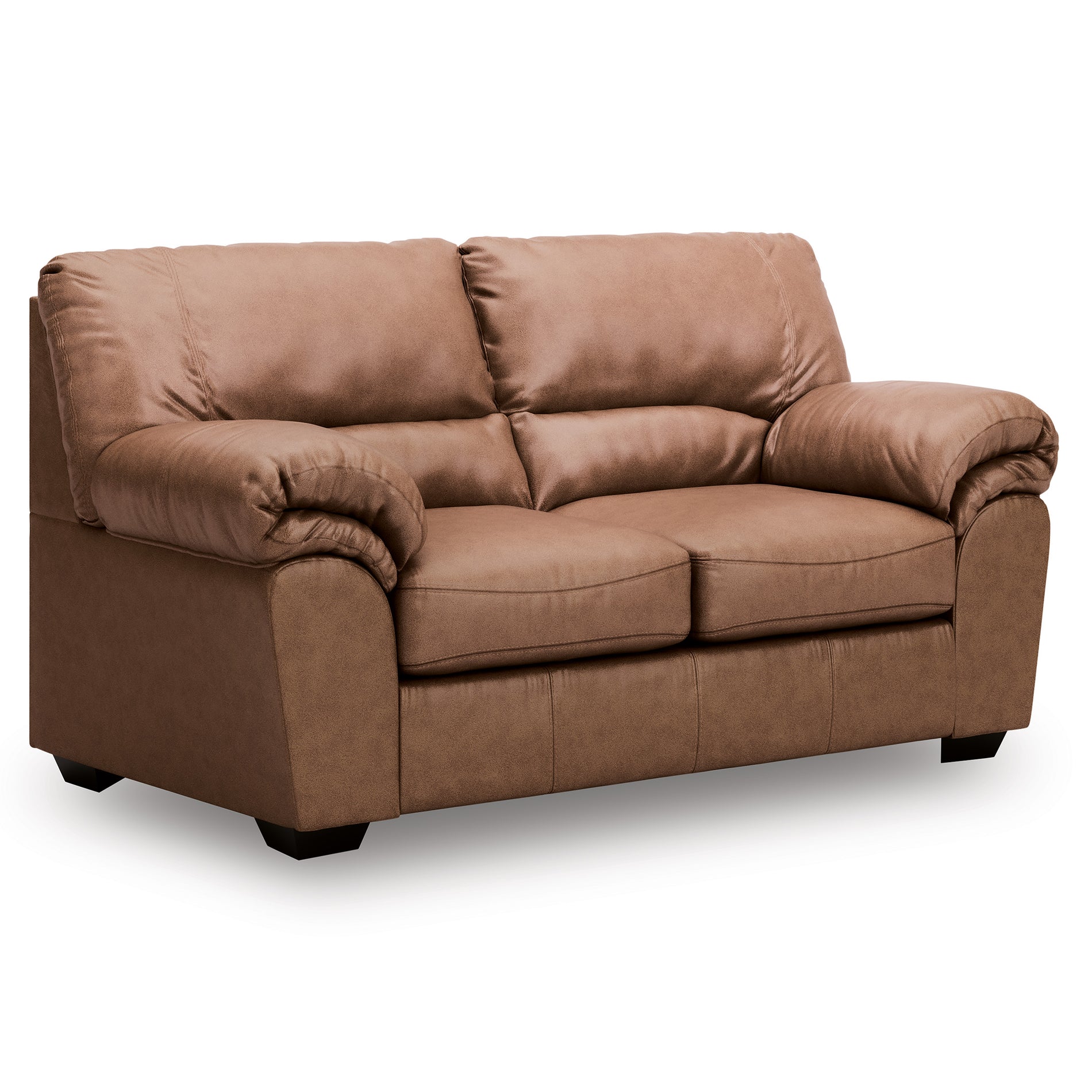 Modern comfort never looked so good. Sporting supremely soft yet durable cushions accented with high-fashion jumbo stitching, this stunning loveseat is the ultimate choice in comfortably cool, contemporary style. Its caramel-hued faux leather indulges with an upscale feel and wows like the real thing.