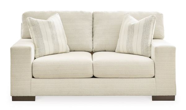 Classic comfort gets a mod twist with this loveseat. Its minimalistic approach and structured silhouette bring a clean-lined design element to your living room. Sink into the positively plush cushions while relaxing solo, or curl up with a glass of wine while hosting guests. And with light neutral upholstery that suits both casual and contemporary spaces, this loveseat offers endless style possibilities.