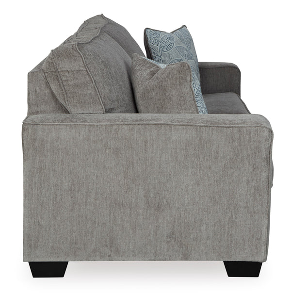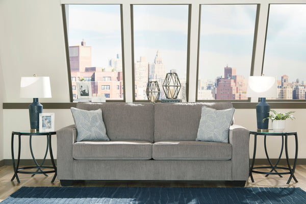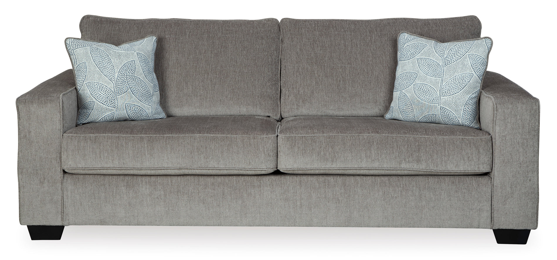 DIMENSION85" W x 38" D x 37" HArm height: 26"Distance between arms: 70"Leg height: 3"Minimum width of doorway for delivery: 32"Seat depth: 20"Seat height: 20"Top of cushion to top of back: 18"20" Toss Pillow:Color: Alloy