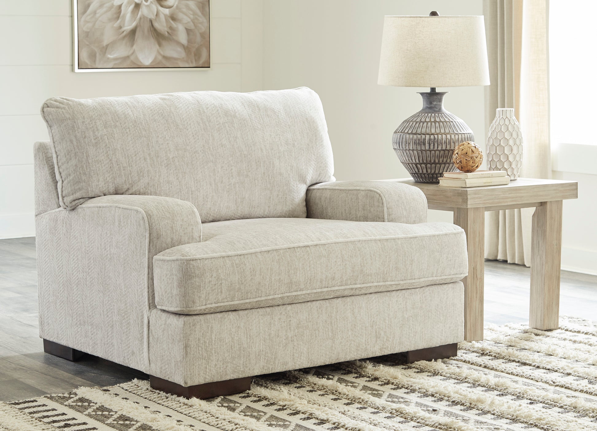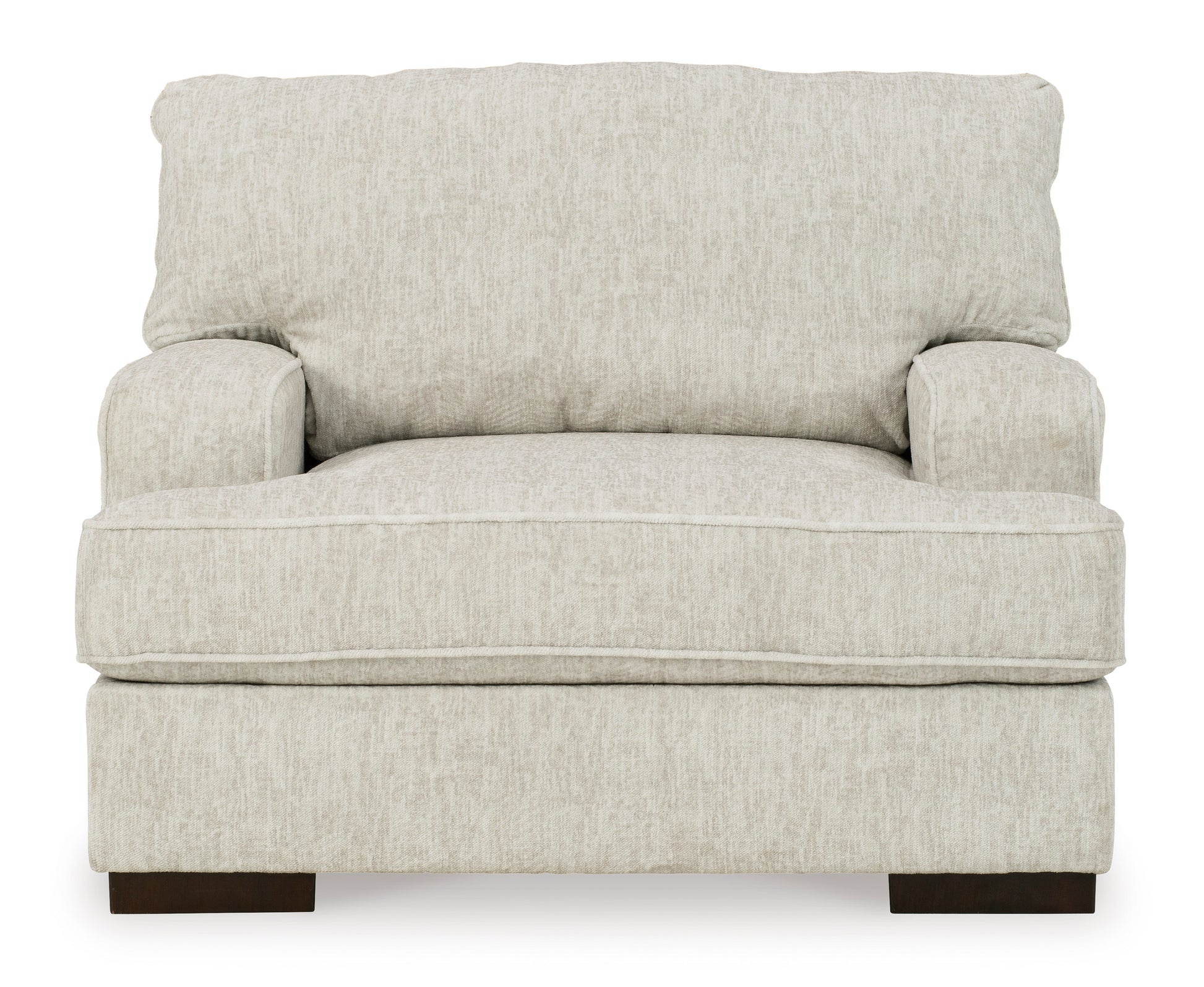 • Decidedly modern with a sense of relaxed ease, this oversized chair looks at home in so many different places and spaces. Providing a highly distinctive look: substantial track arms with curved cornering, wrapped t-cushioning and low-to-the-floor block feet in a warm wood-tone finish. Sporting a subtle chevron texture, the parchment-tone upholstery takes neutral to new heights.