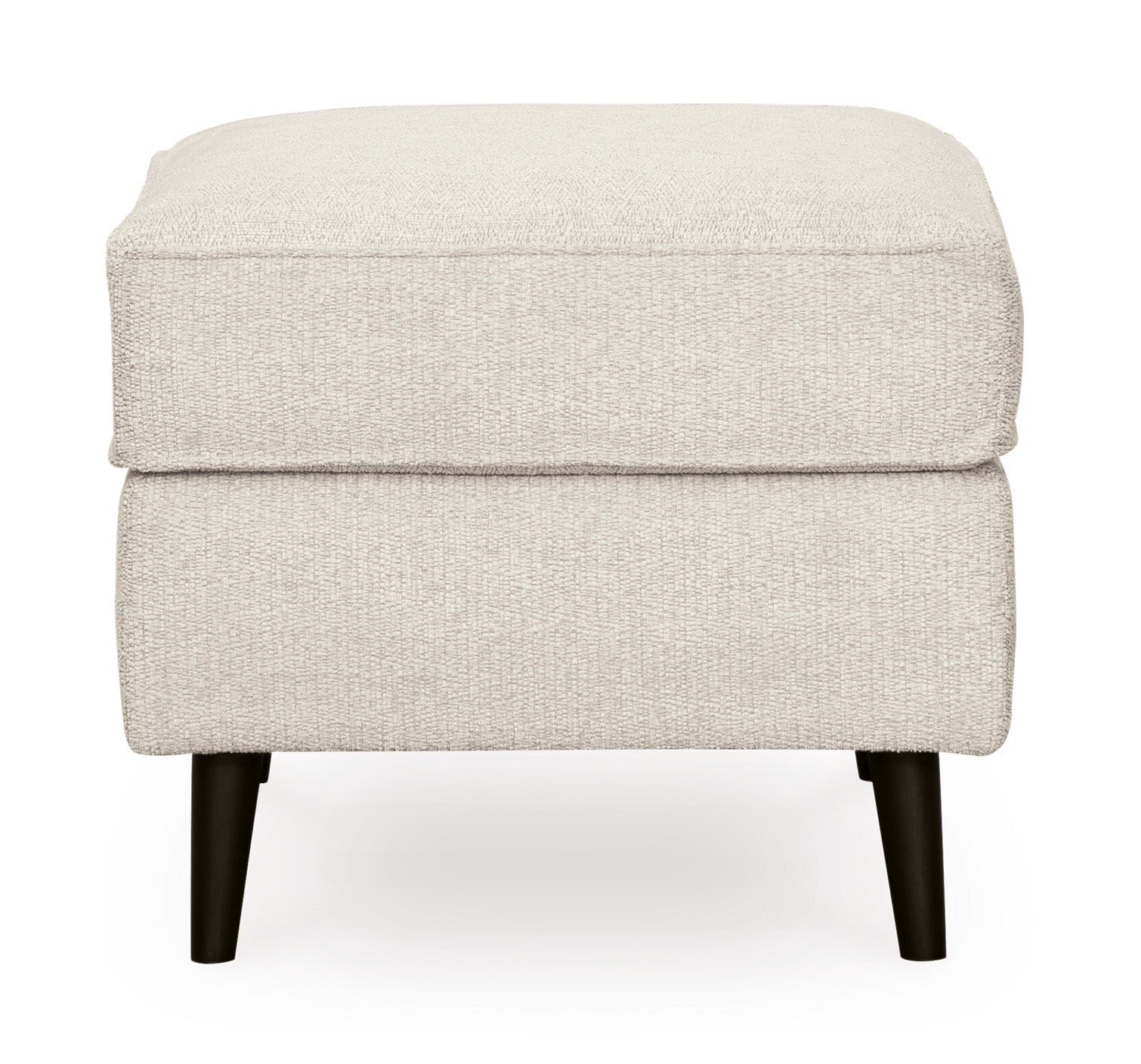 • This designer ottoman is mid-century revival done to perfection. Linear and minimalistic, the beautifully edited profile includes tapered legs for a signature retro aesthetic. So casually cool, the crisp fabric upholstery brings the look right into the present.