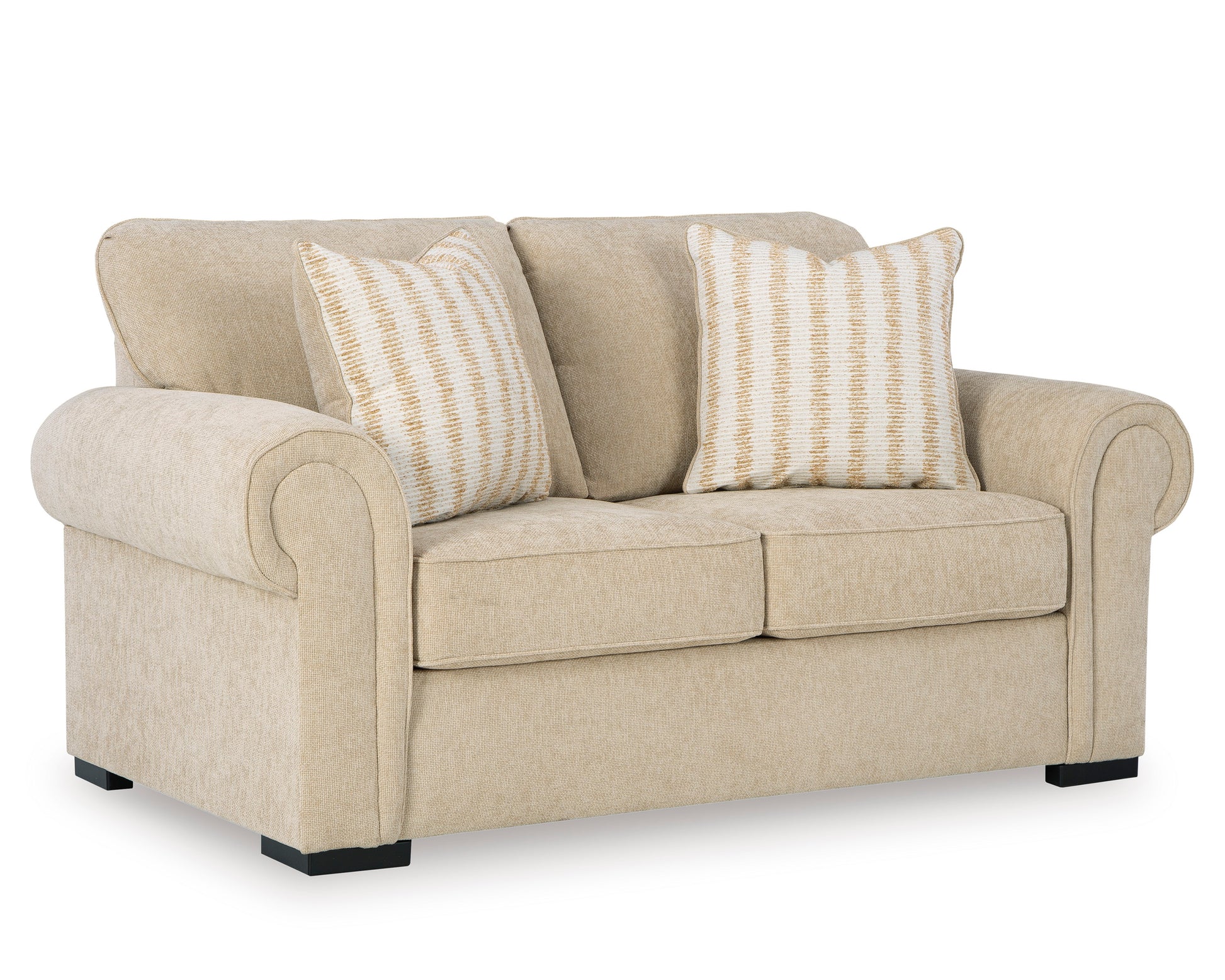 • Traditional styling. Casual comfort. And plenty of room to stretch out. This loveseat is exactly your style. It beautifully references the past with roll arms and other classic touches. Better yet, the indulgently soft and light chenille upholstery incorporates a tranquil sensibility that feels right at home. Accent pillows with a reimagined patchwork design add the finishing touch.