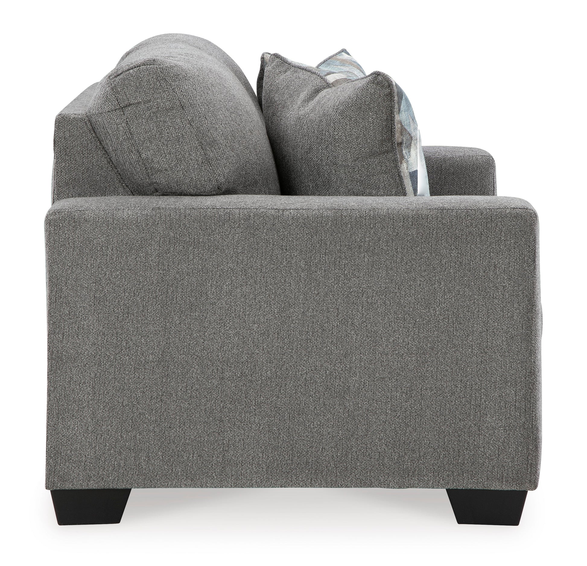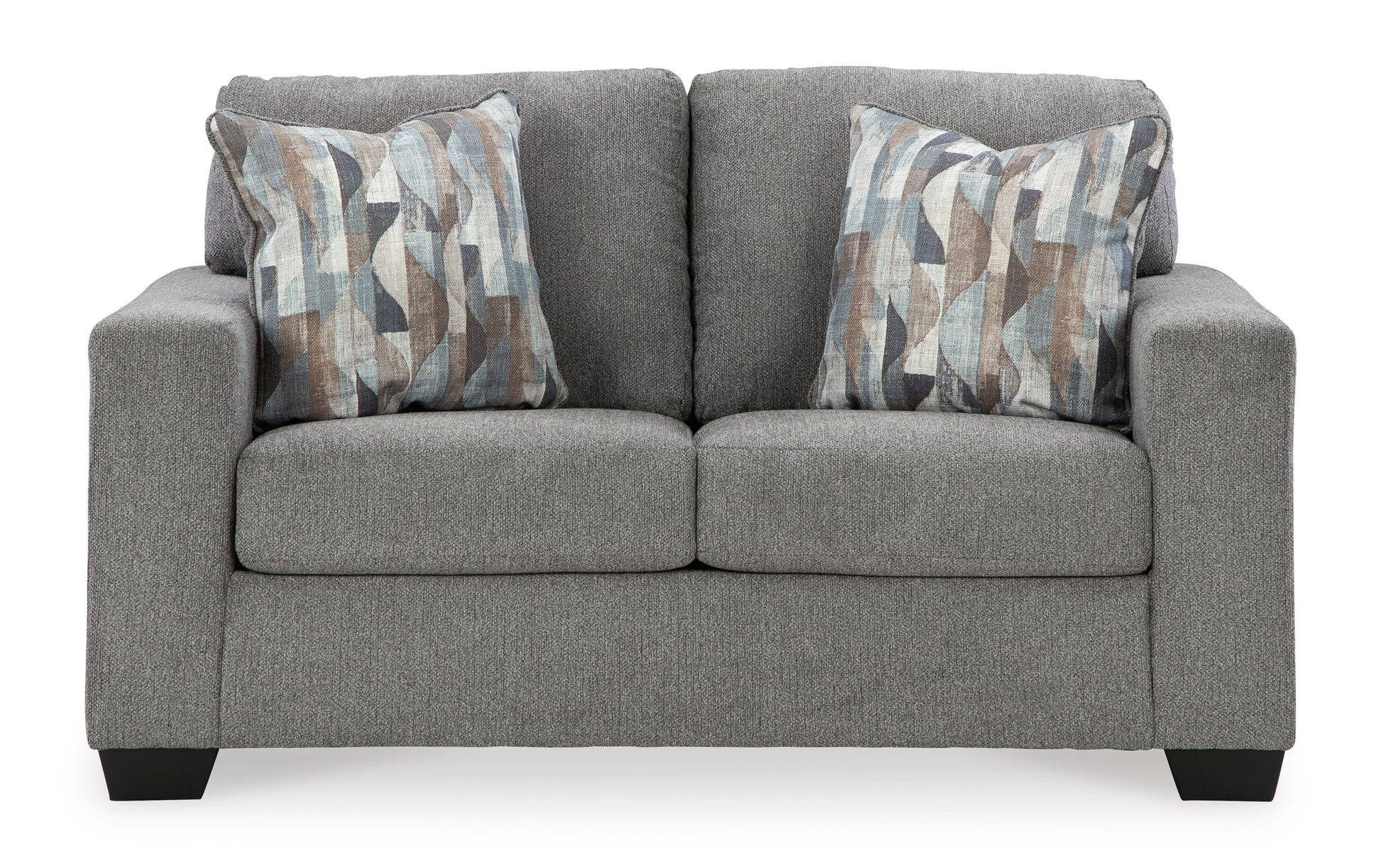• You’re in for a neat treat with this loveseat. Its comfy seats are covered in soft, textural upholstery, and the wide track arms are eager to support your quest for total relaxation. Distressed abstract toss pillows bring a fresh breath of contemporary style while accentuating the loveseat's color.