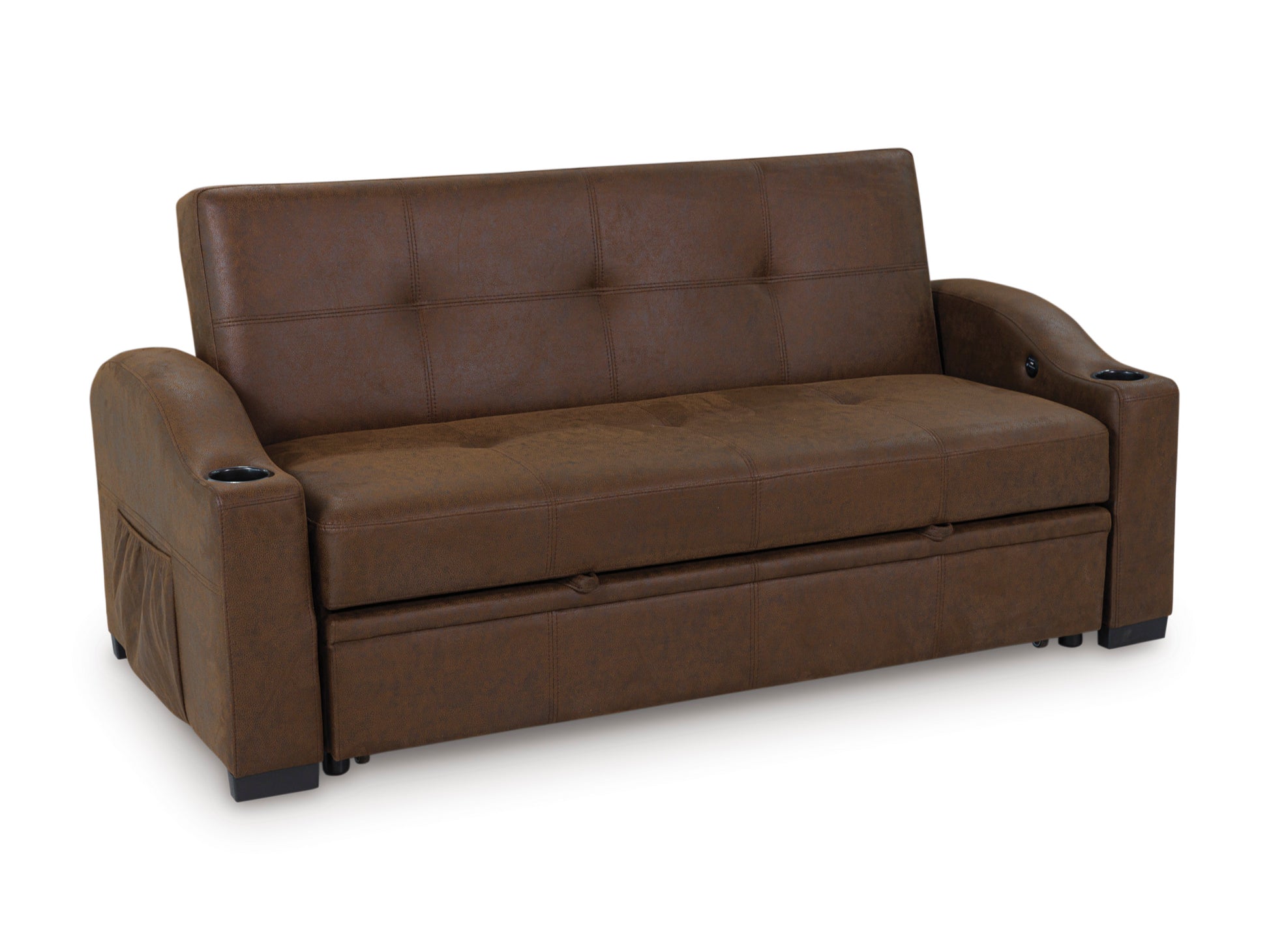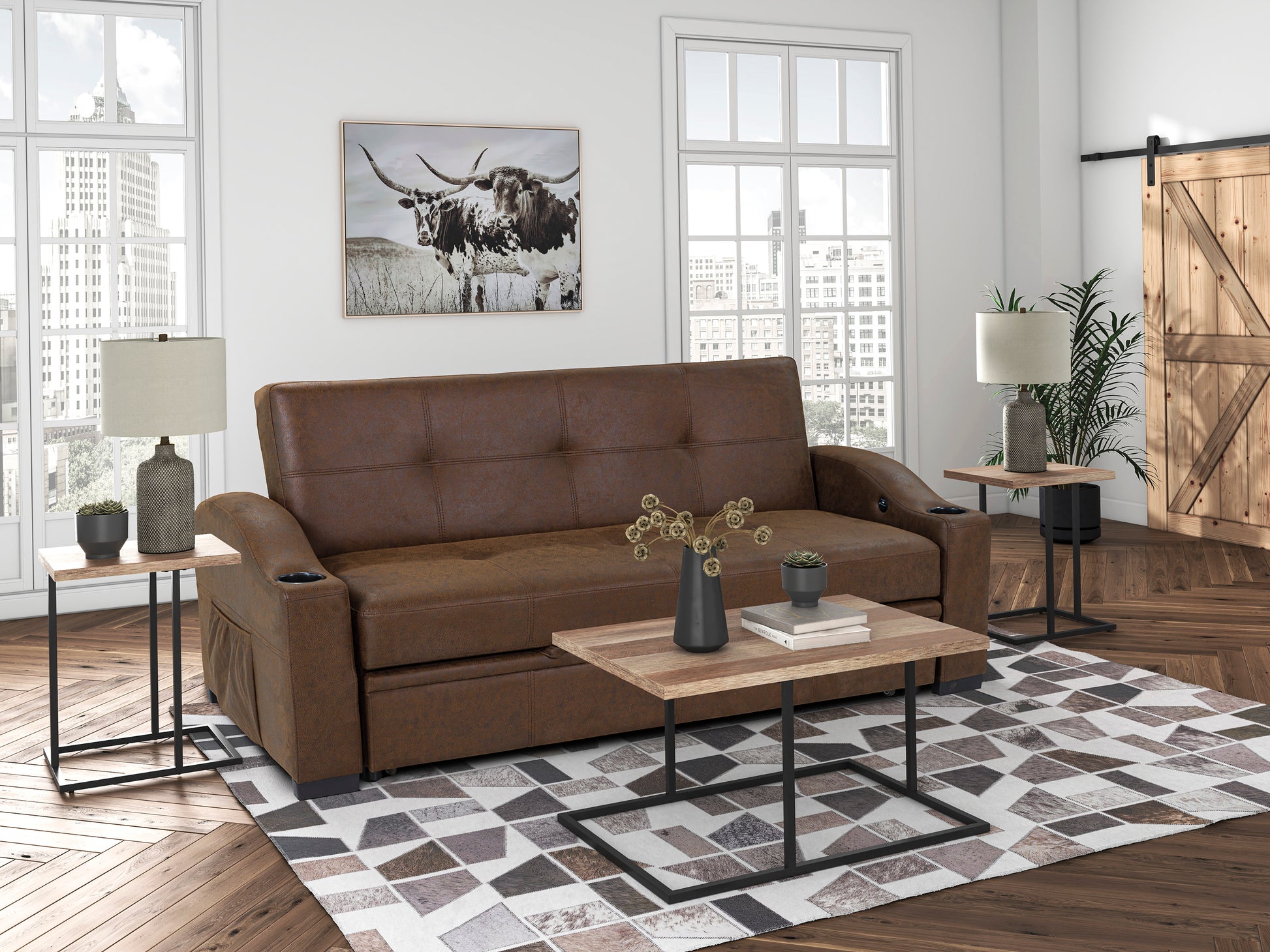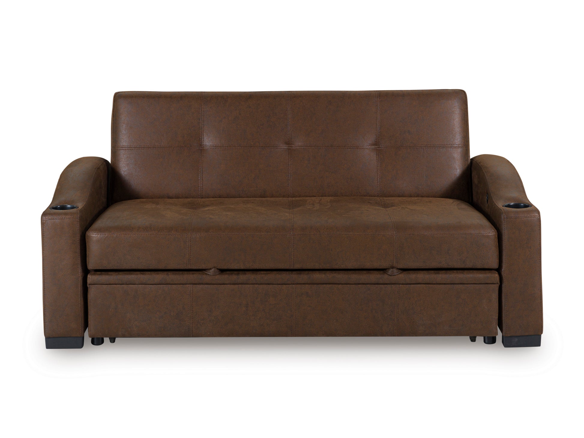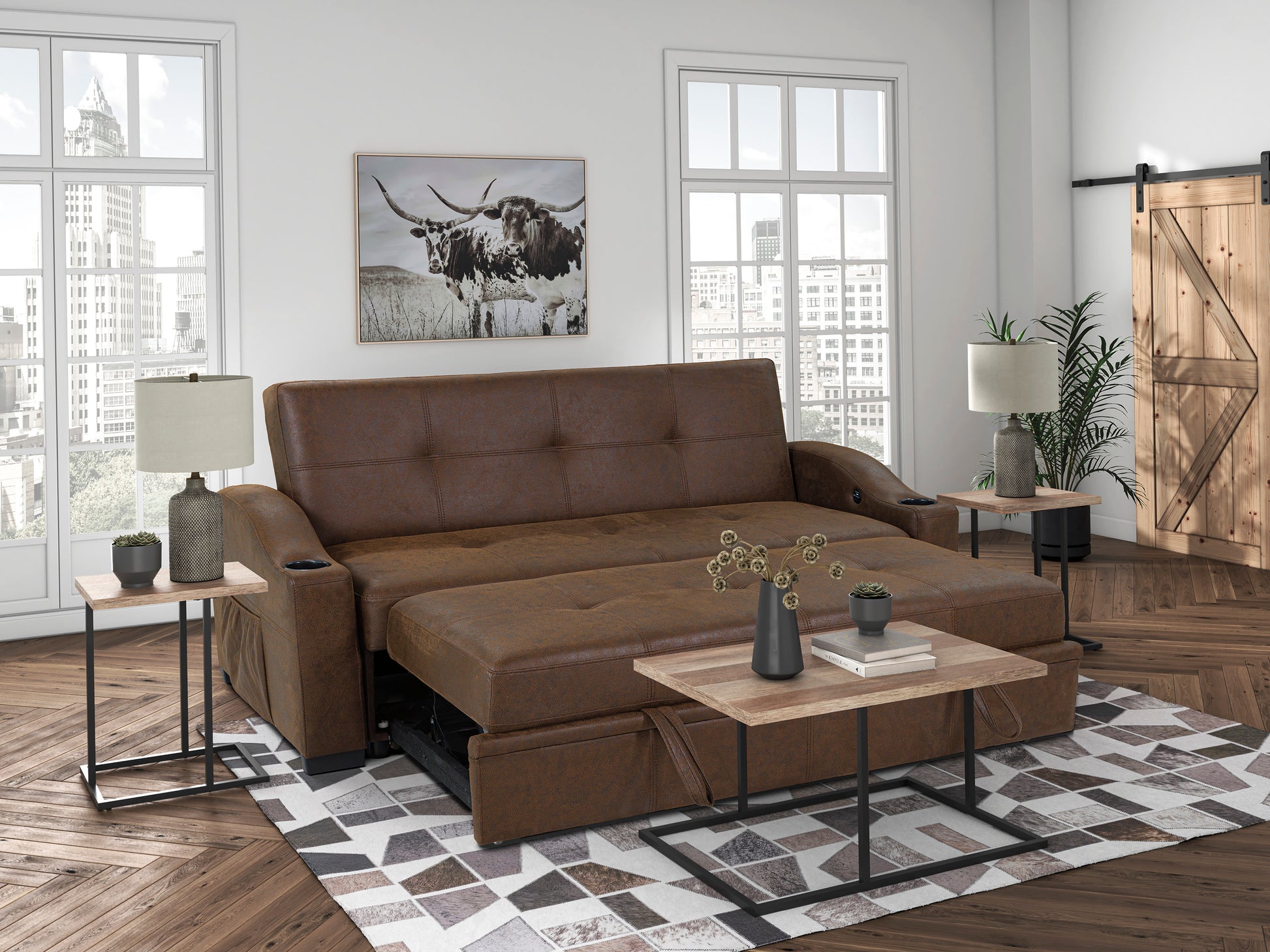 • This versatile pop-up sleeper is perfect for small-space living or hosting overnight guests. This clever piece easily converts from a comfy sofa to a convenient bed, with handy charging ports and magazine pouches for added functionality. Dark brown faux leather upholstery and low-profile legs add a touch of style and sophistication.
