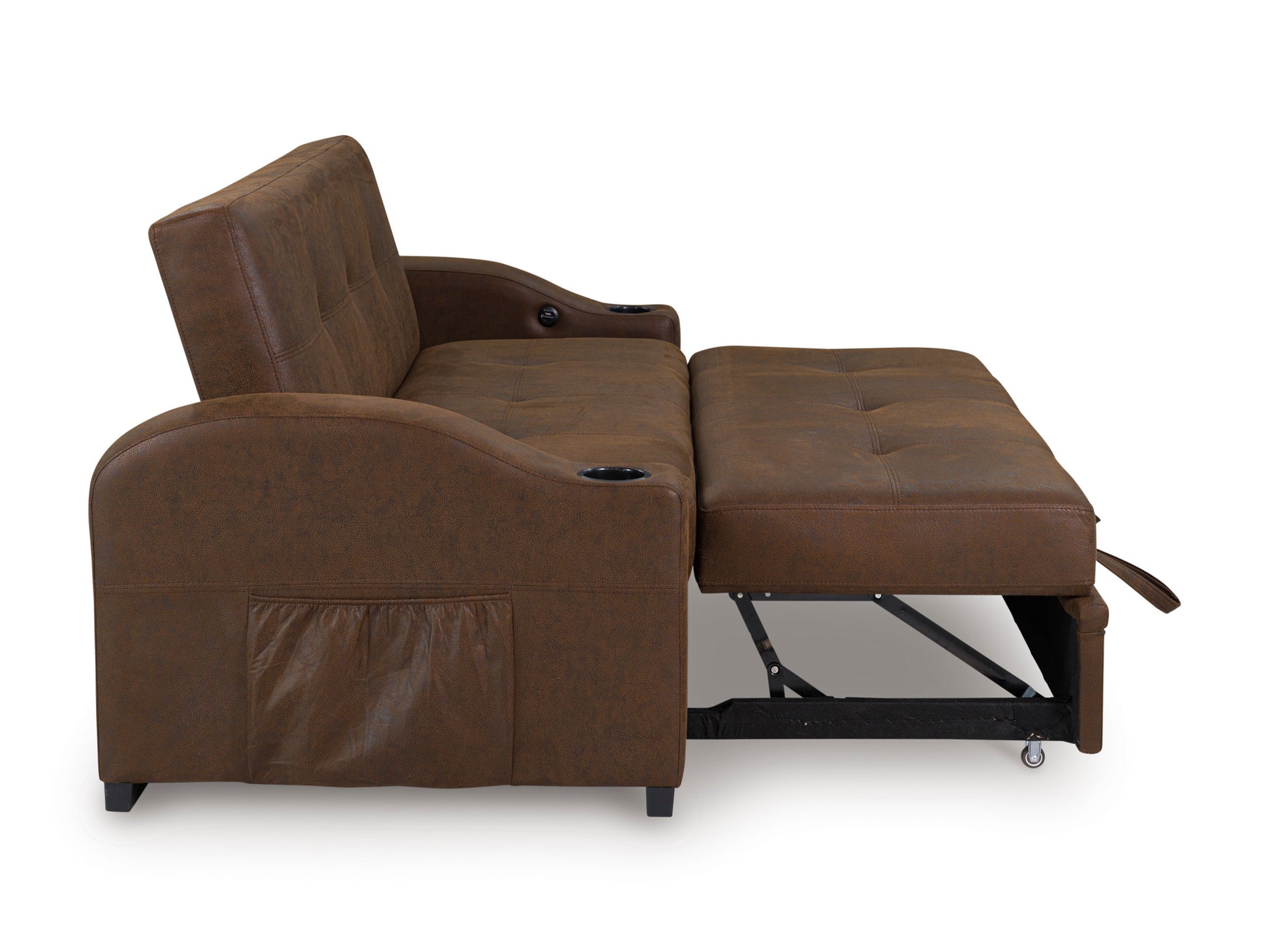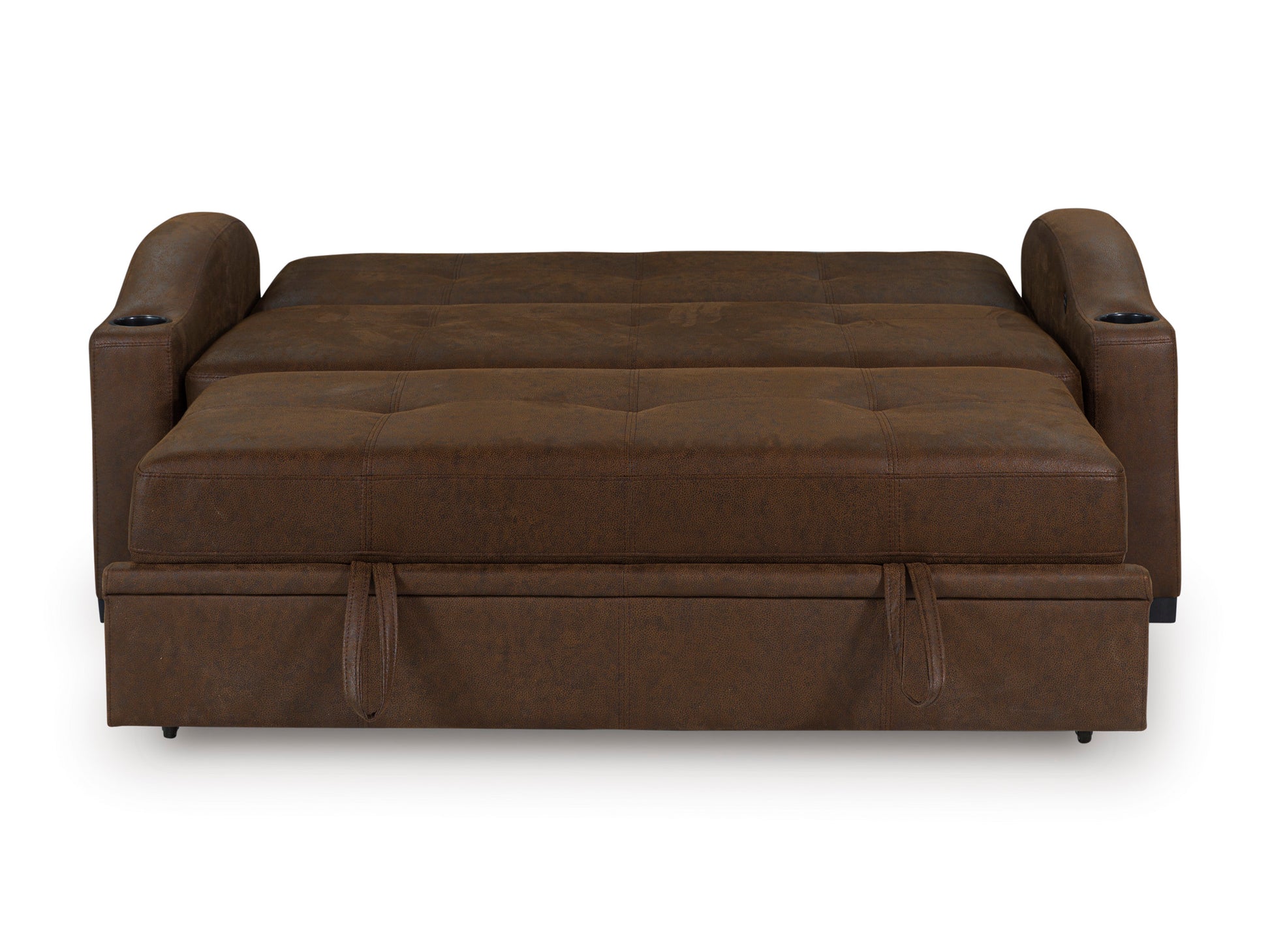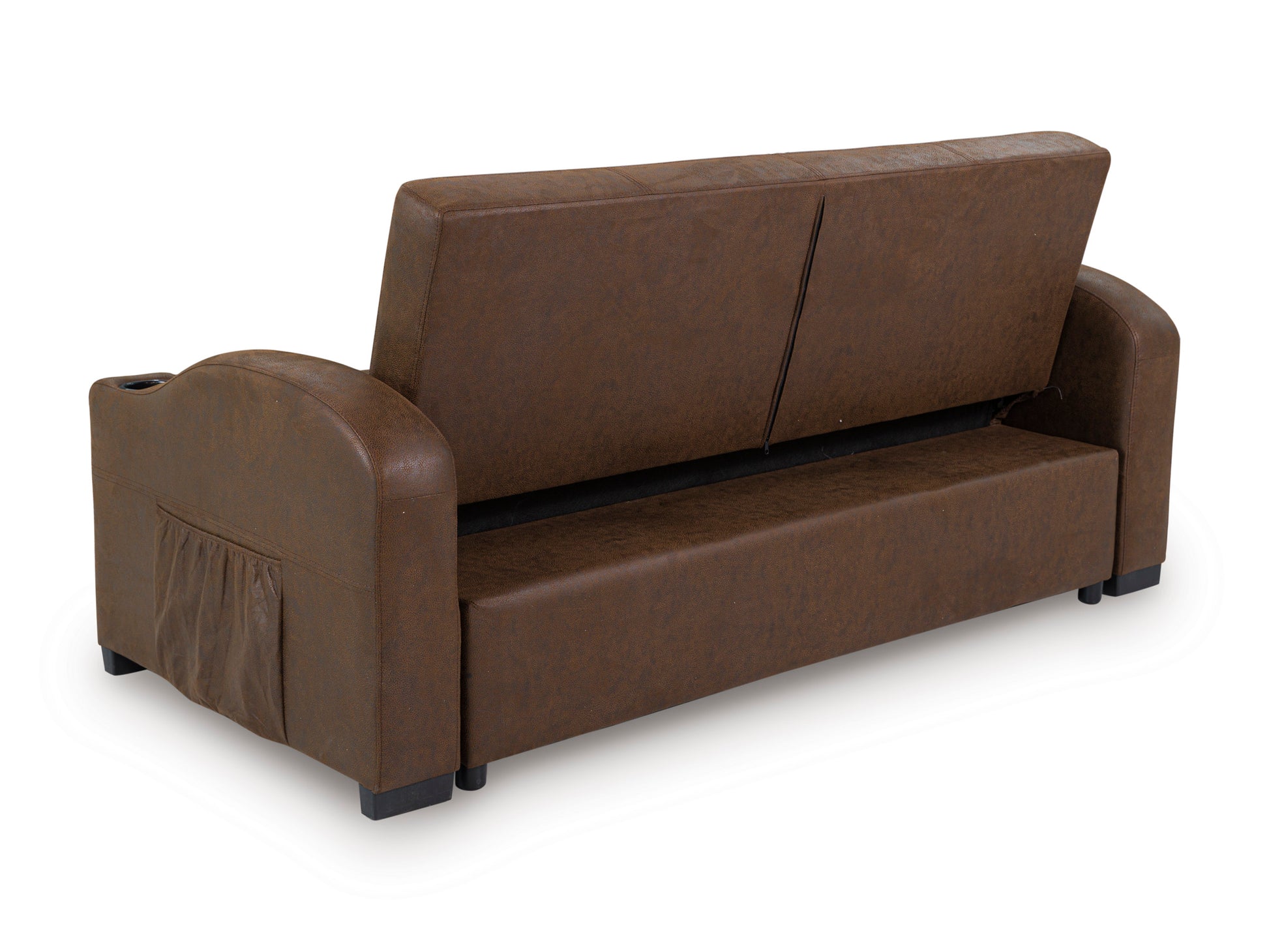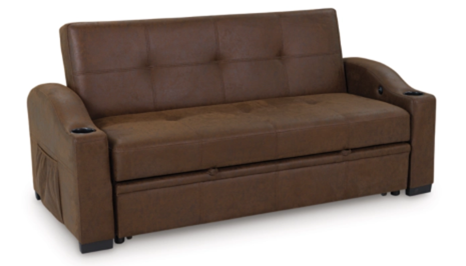 • This versatile pop-up sleeper is perfect for small-space living or hosting overnight guests. This clever piece easily converts from a comfy sofa to a convenient bed, with handy charging ports and magazine pouches for added functionality. Dark brown faux leather upholstery and low-profile legs add a touch of style and sophistication.