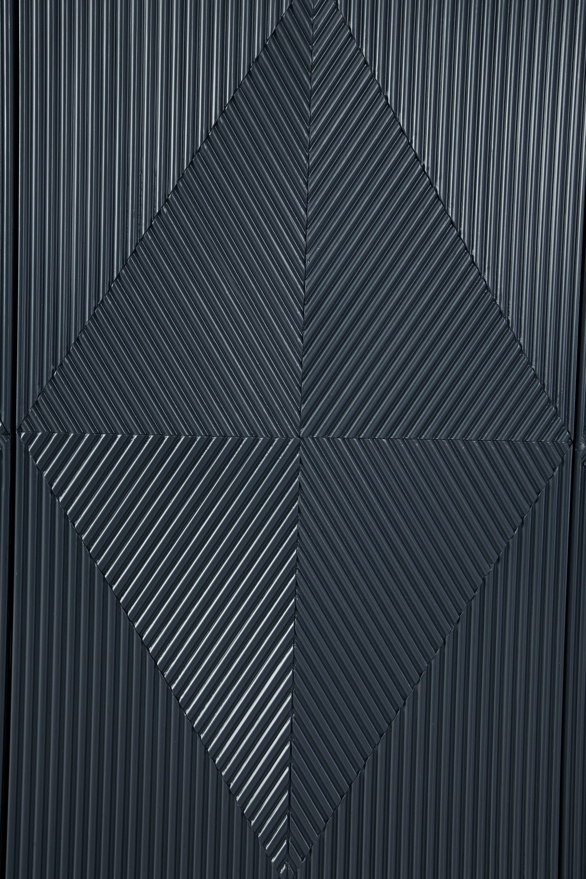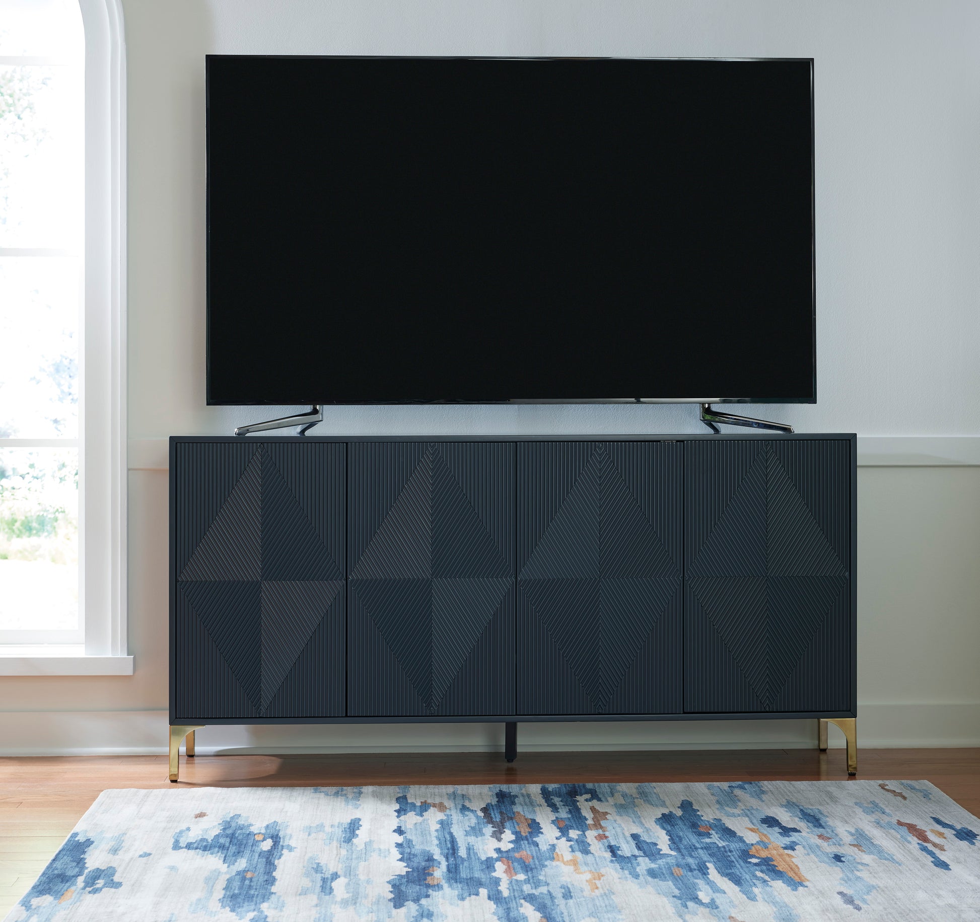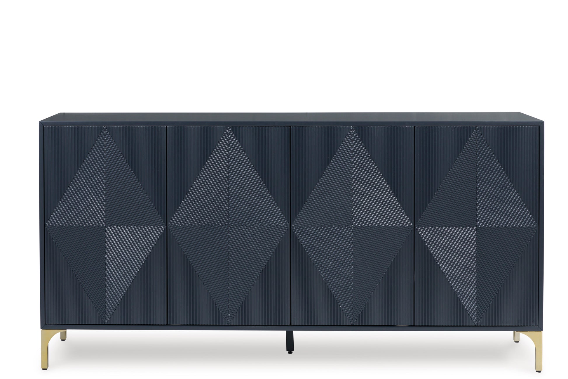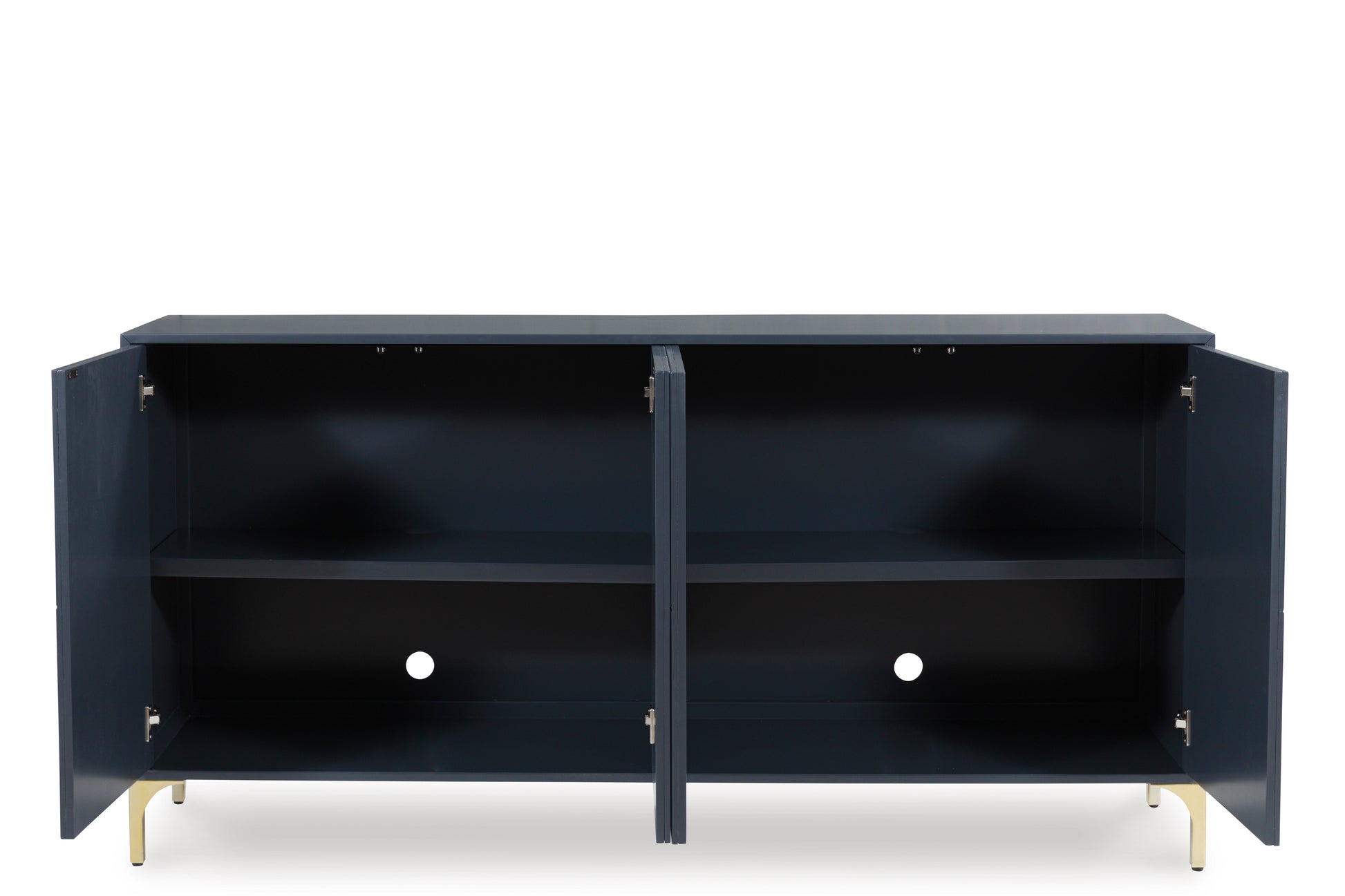 • Elevate your aesthetic with the chic design of this accent cabinet. Sleek goldtone legs and striking doors with a geometric pattern infuse contemporary flair wherever you place this piece. Add a dark blue finish, and you've got a stunning showstopper. Providing function to form, the cabinet's push magnetic doors reveal two shelves and openings for electronics.