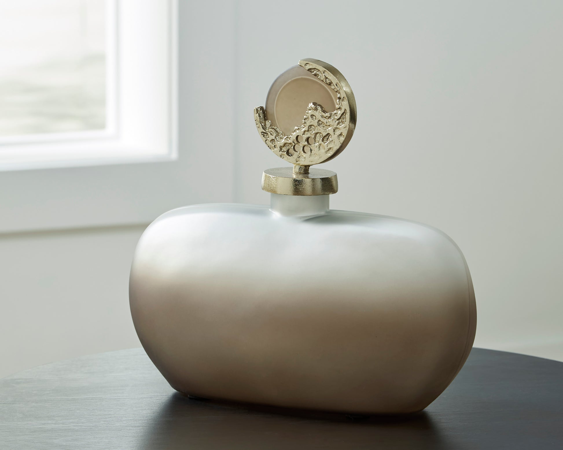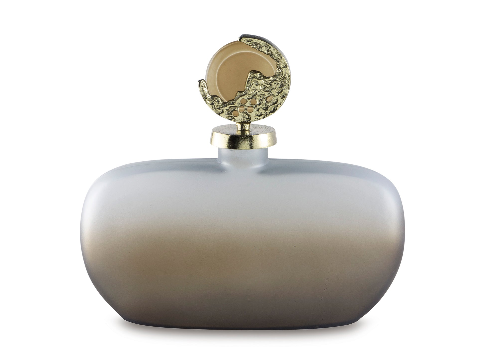 Bring stately elegance home with this jar. Made with frosted glass in a luxurious taupe finish, its ombre effect adds visual intrigue to a shelf or mantle. A textured goldtone topper provides an added dose of traditional flair.