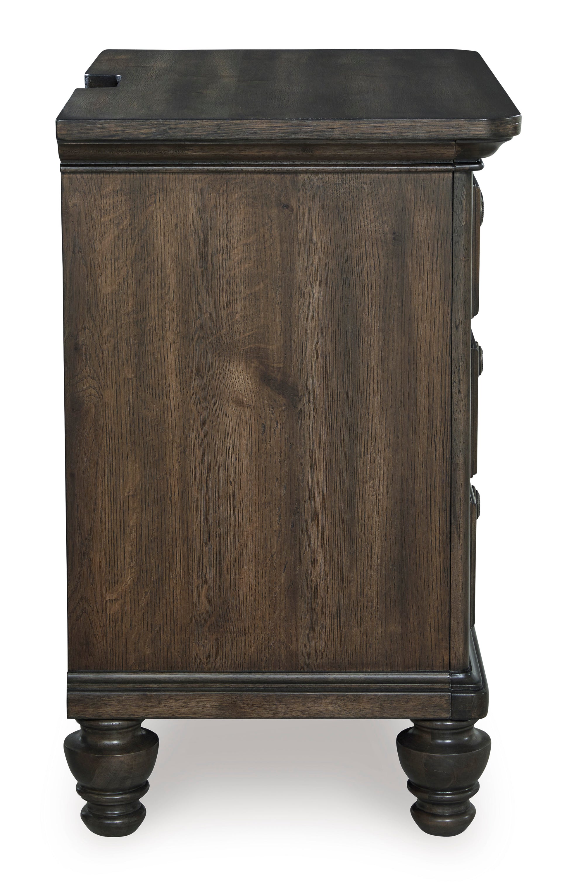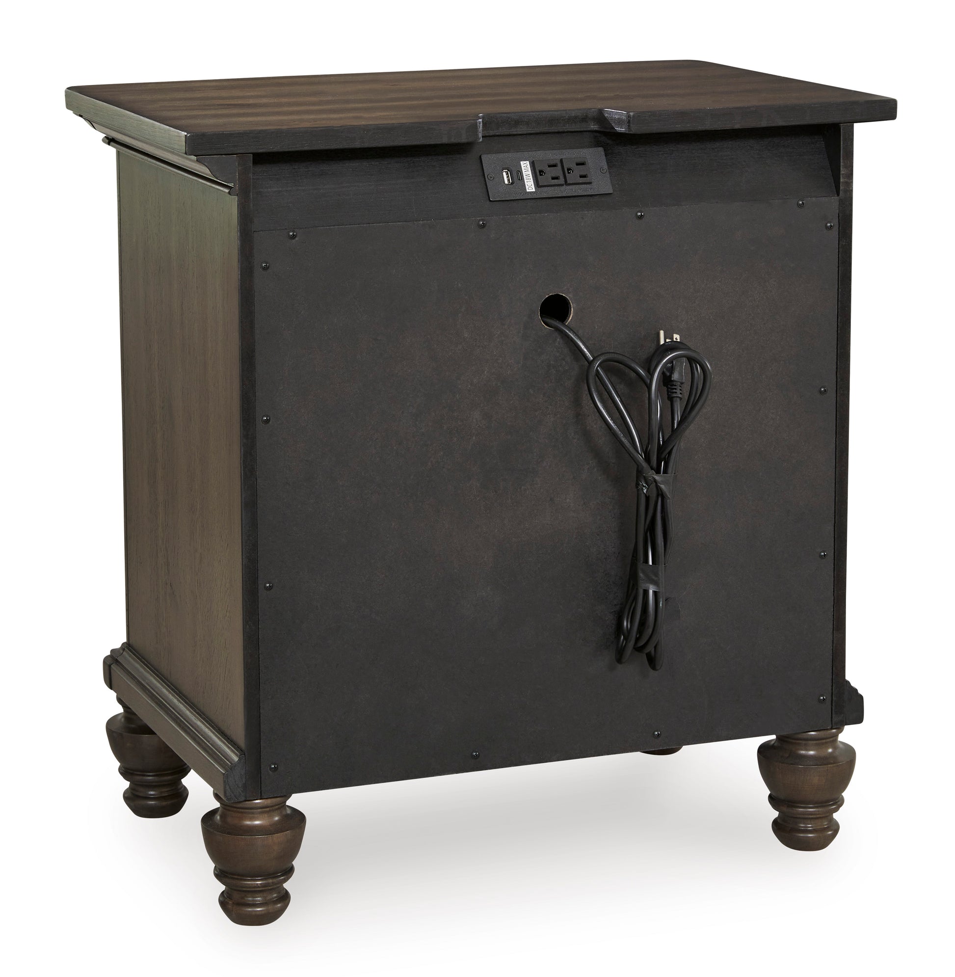 • For those who appreciate a traditional aesthetic with understated elegance, this nightstand brings home a dreamy look with fashionable functionality. Its rich brown walnut finish merges seamlessly with the spacious storage drawers, profiled top and shapely bun feet for a richly classic appeal. A discreetly placed power supply and USB charging keep devices powered up 24/7. And did we mention the antiqued hardware?