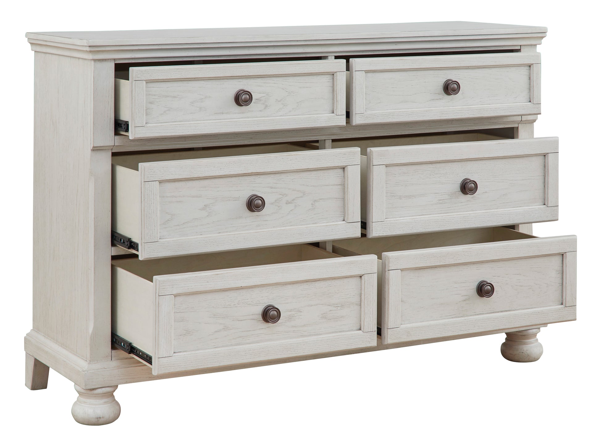 • Elegant, timeless furnishings take your bedroom to the next level. Nothing does that better than this dresser and mirror. The antiqued white finish with a wonderful grain texture radiates sophistication, while dark bronze-tone knobs add an ornate touch. Felt finishing in the upper drawers rounds out this tasteful set.