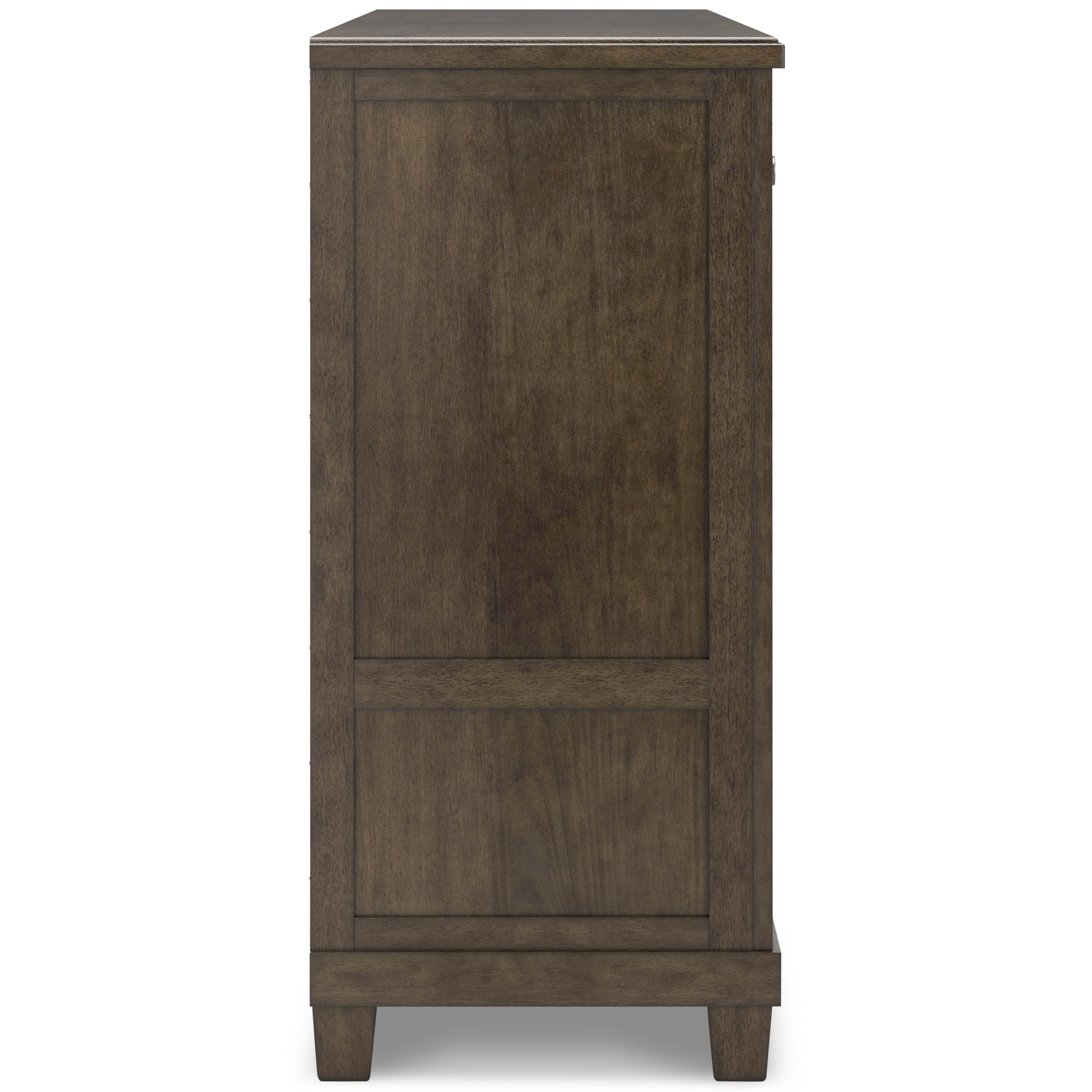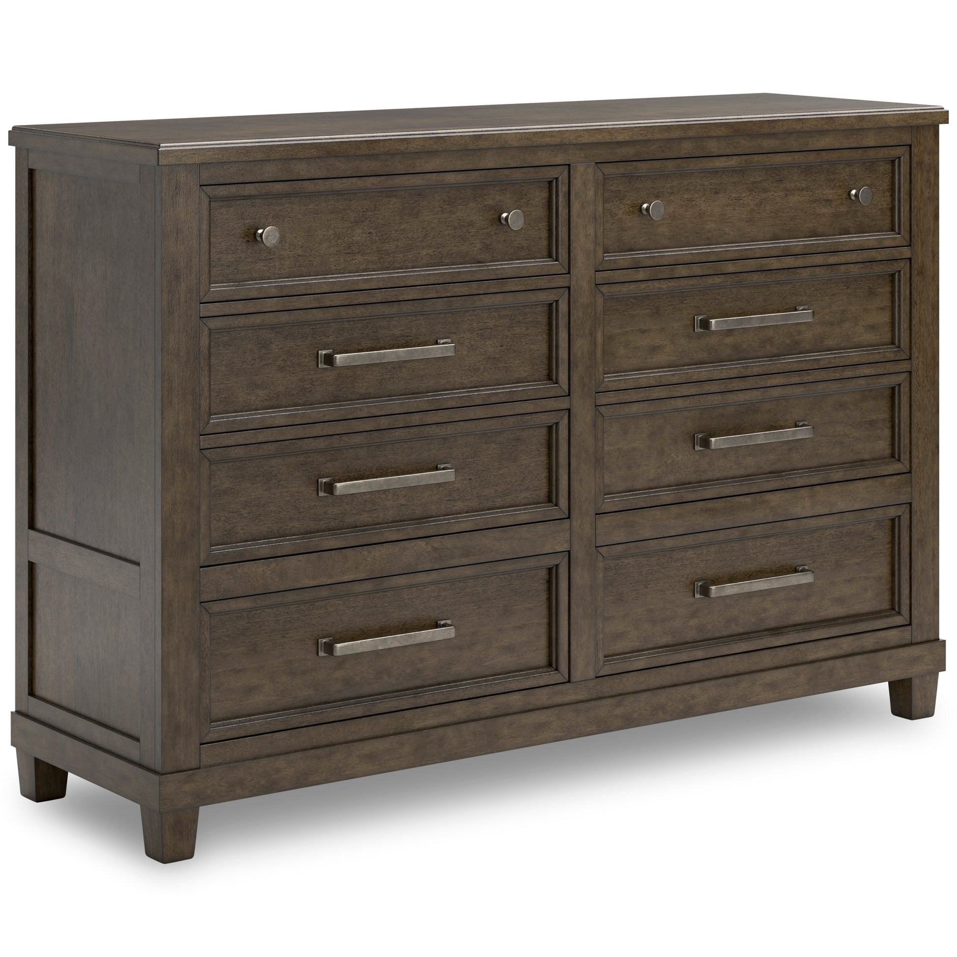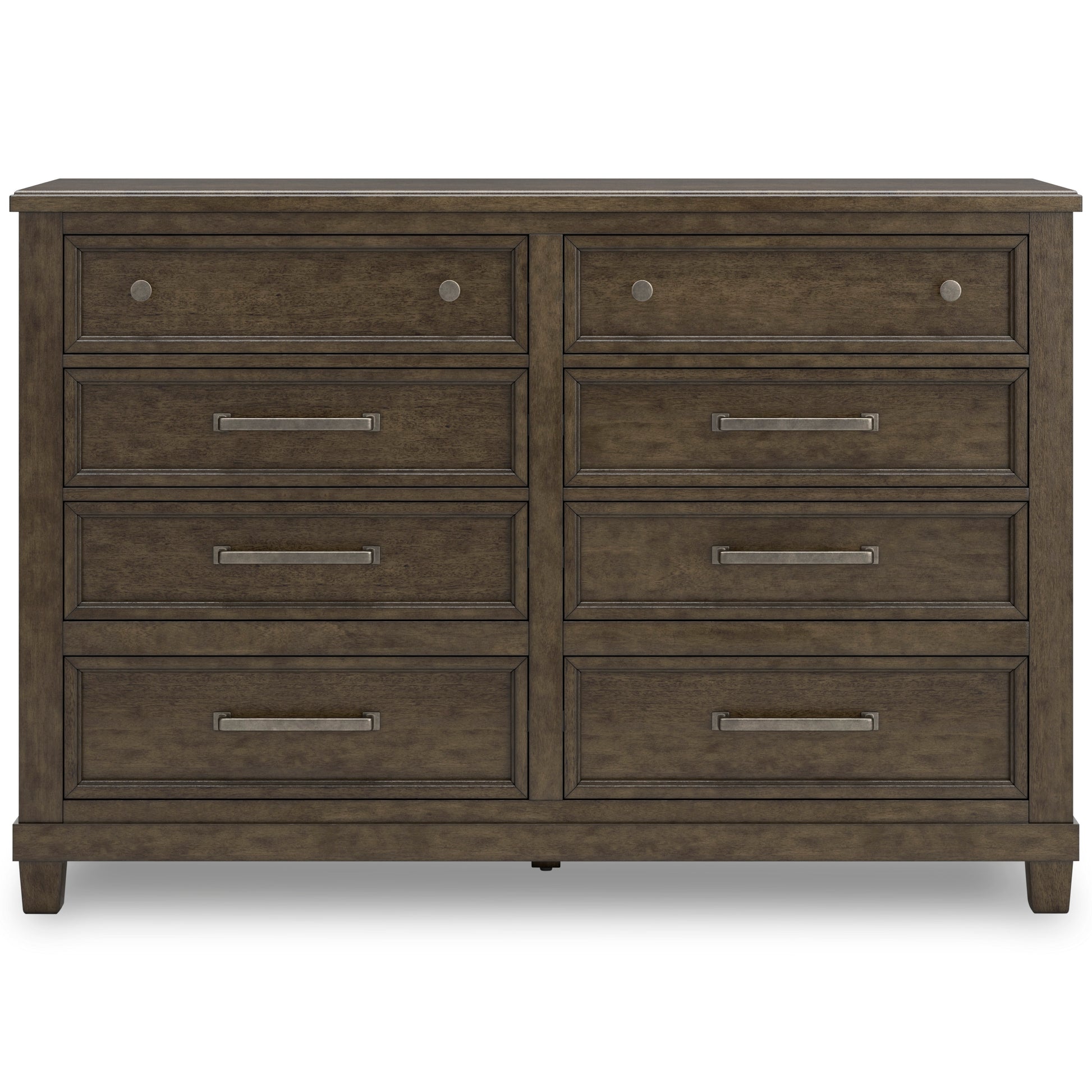With its lively, dark brown distressed finish, the Hillcott dresser gives modern farmhouse styling a rich, substantial sensibility. Its sturdy silhouette is beautified with inset framed drawers and a framed herringbone inlay top that’s truly outstanding. Thick utilitarian bar pulls are paired with round knobs for an interesting mix. Eight smooth-gliding drawers generously accommodate your wardrobe needs.