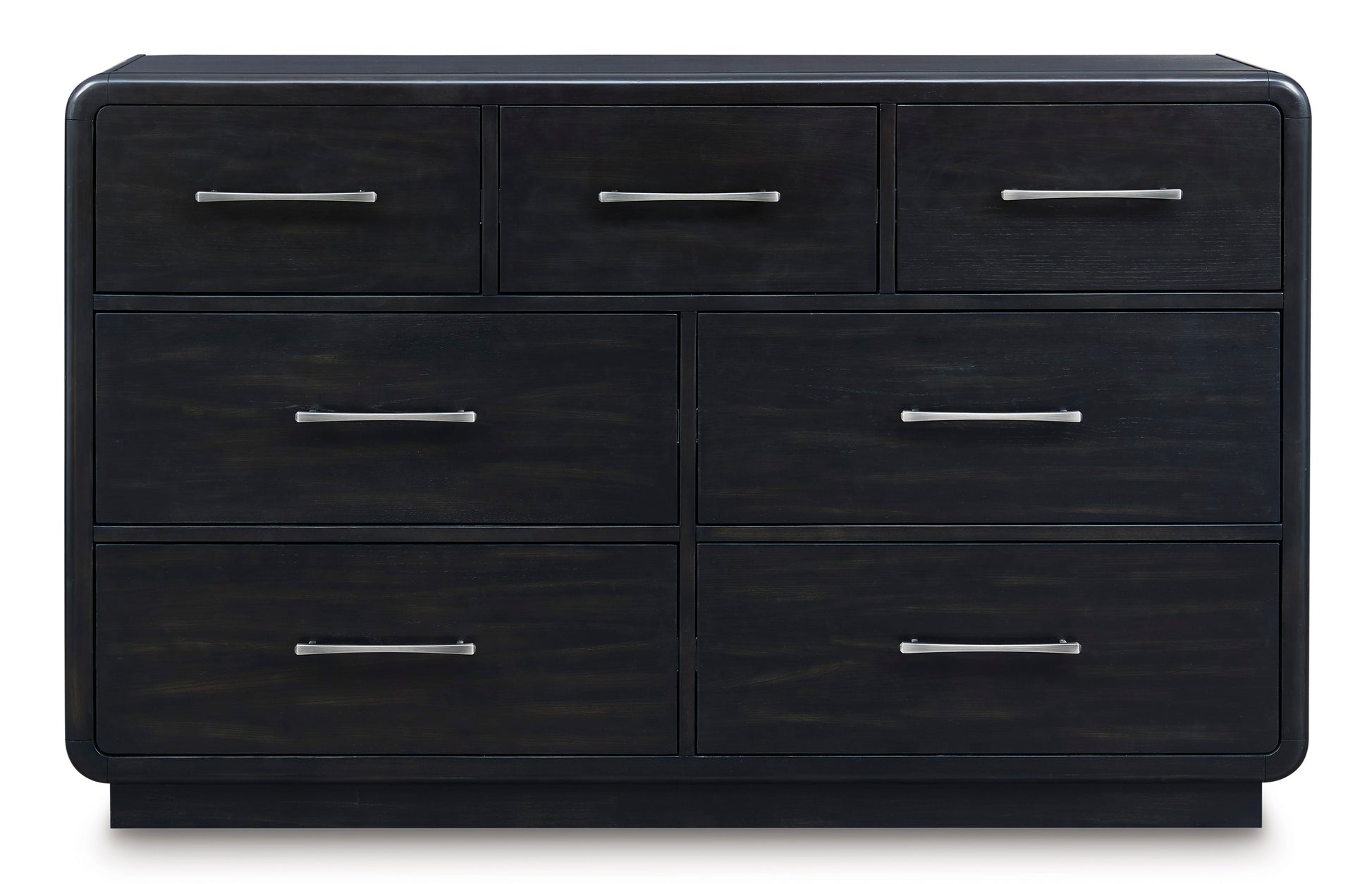 • Inspired by art deco design, this softly shaped dresser with mirror makes a lasting impression in a simply stunning way. Its magnificent curved silhouette is enhanced by a rich layered black finish on the textured wood grain surface. This is the statement piece you’ve been dreaming of to elevate your contemporary inner sanctum.