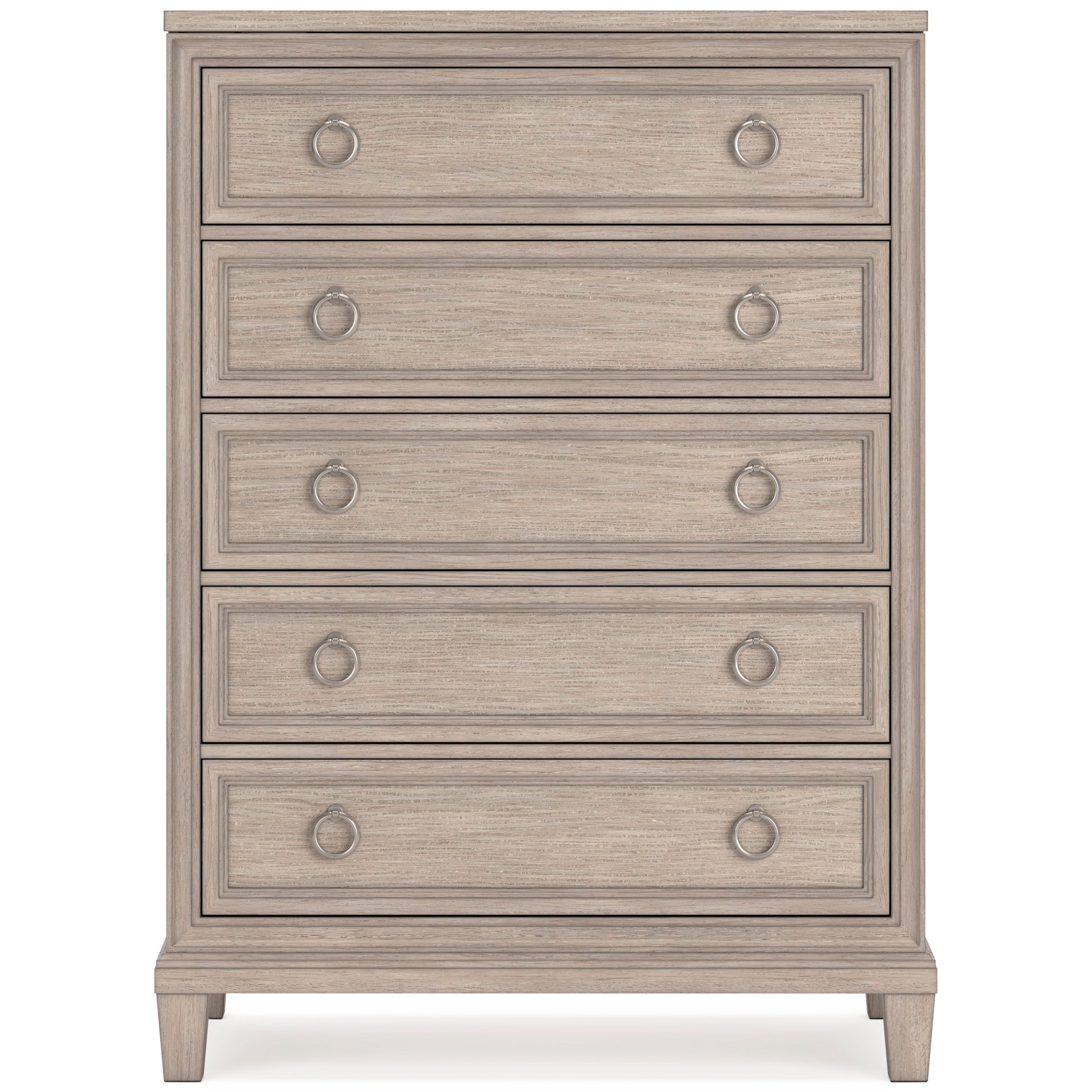 • This striking chest of drawers looks equally at home in traditional or modern settings. A fresh, light gray finish offers a casual modern look. Spacious drawers incorporate picture frame moulding and satin nickel-tone pulls for a clean yet sophisticated design. Combined with the top's chic inset metal frame, it's a wonderful style awakening in the bedroom.