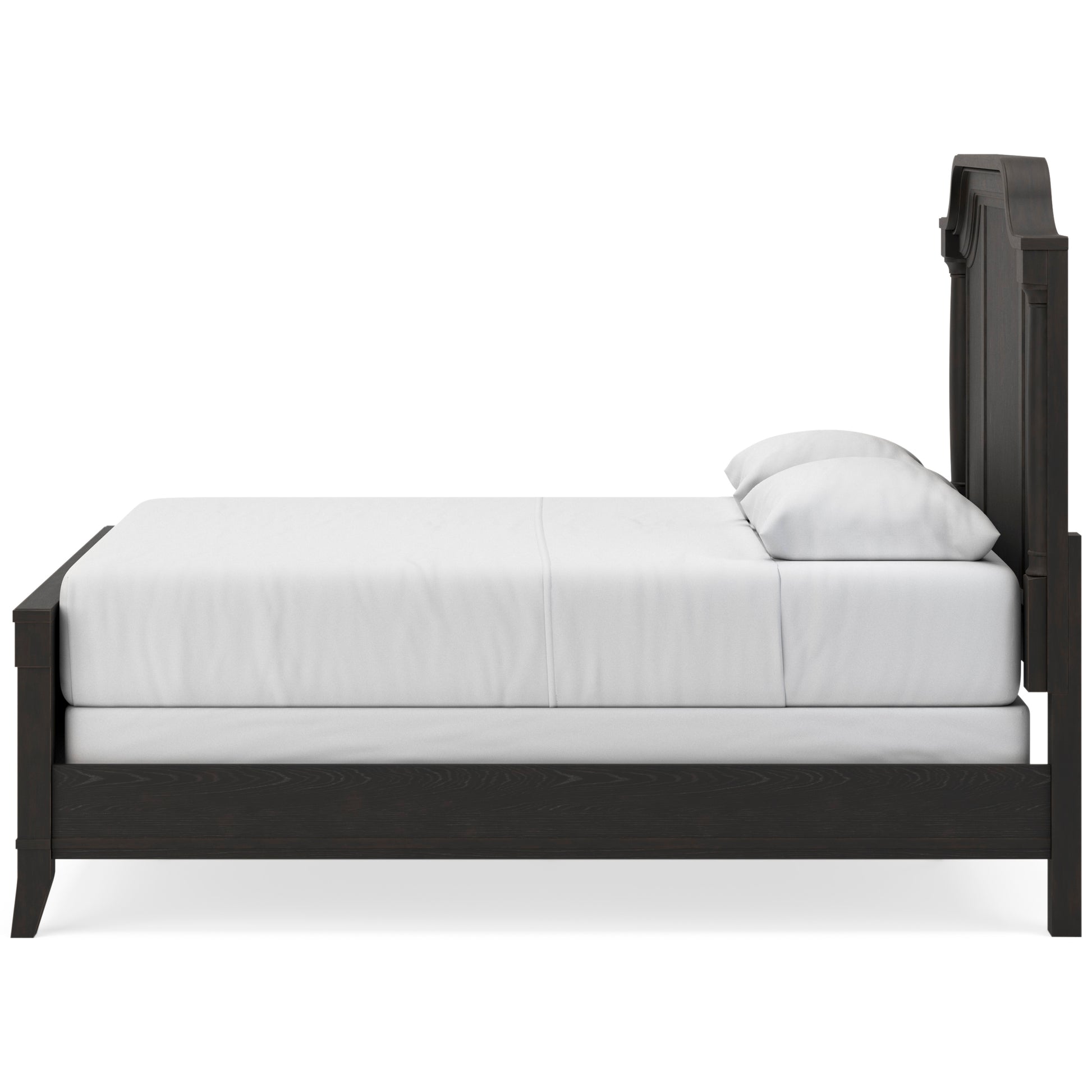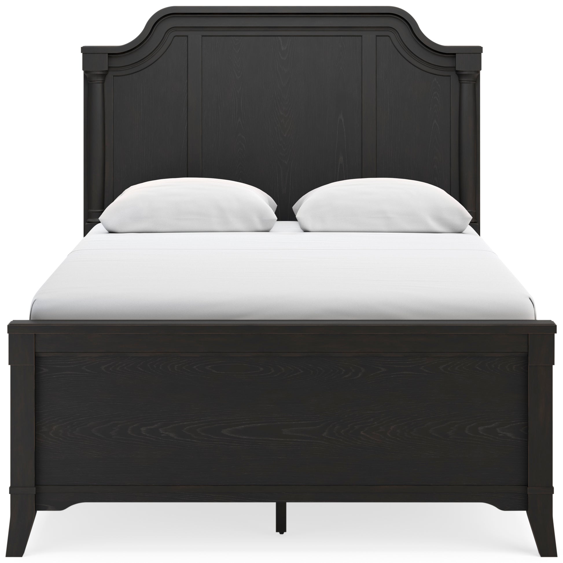 • For those who love the classic profiles of traditional design—but want to forego the overly formal details—behold this queen panel bed. Saber legs, along with the framed headboard's gracefully shaped crown and stylish half round posts, add distinctive touches. A rich layered black finish on the textured wood grain surface with rubbed-through edges offers a subtle sense of gently aged charm. What a beautiful take on urban revival design.