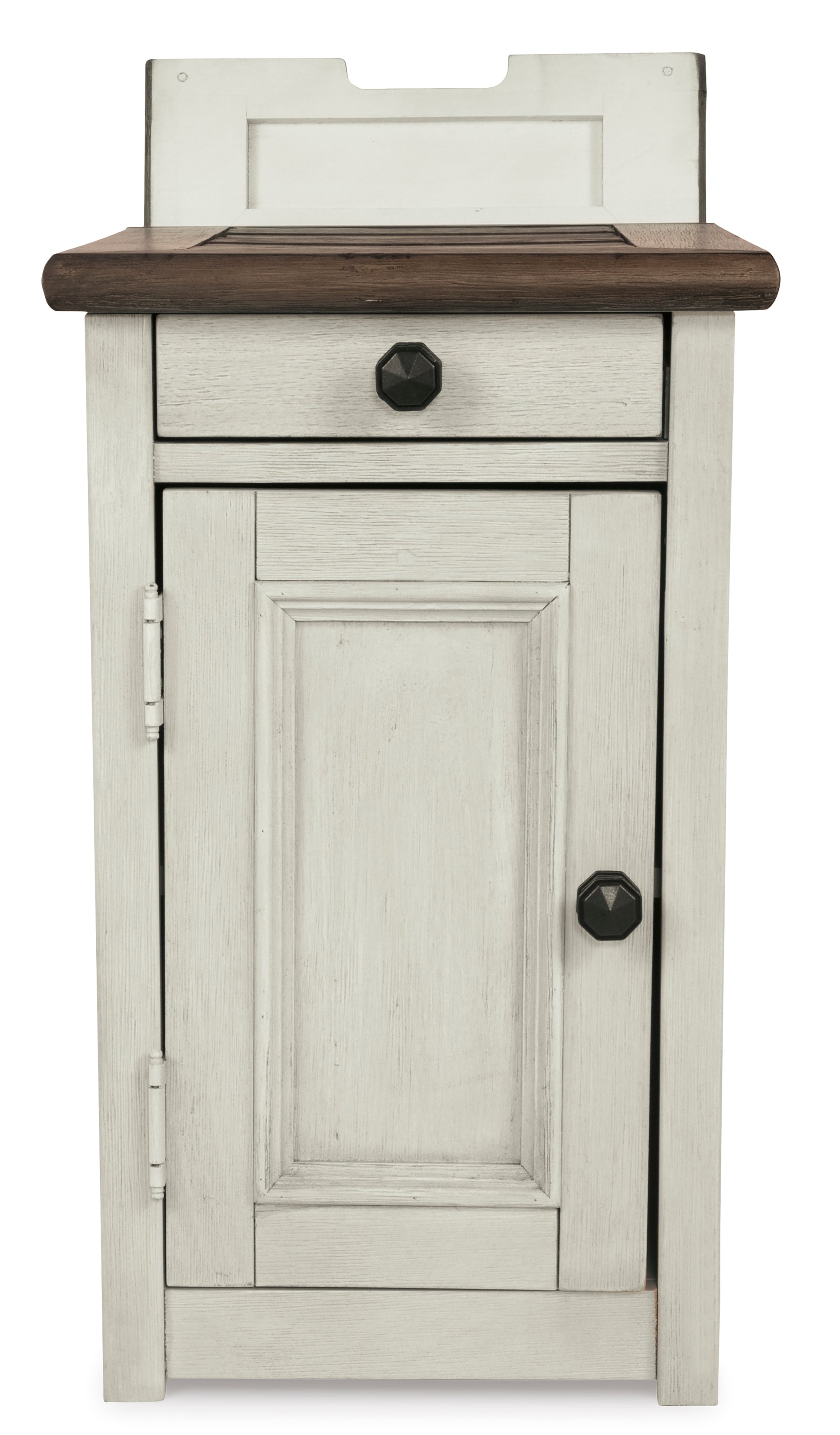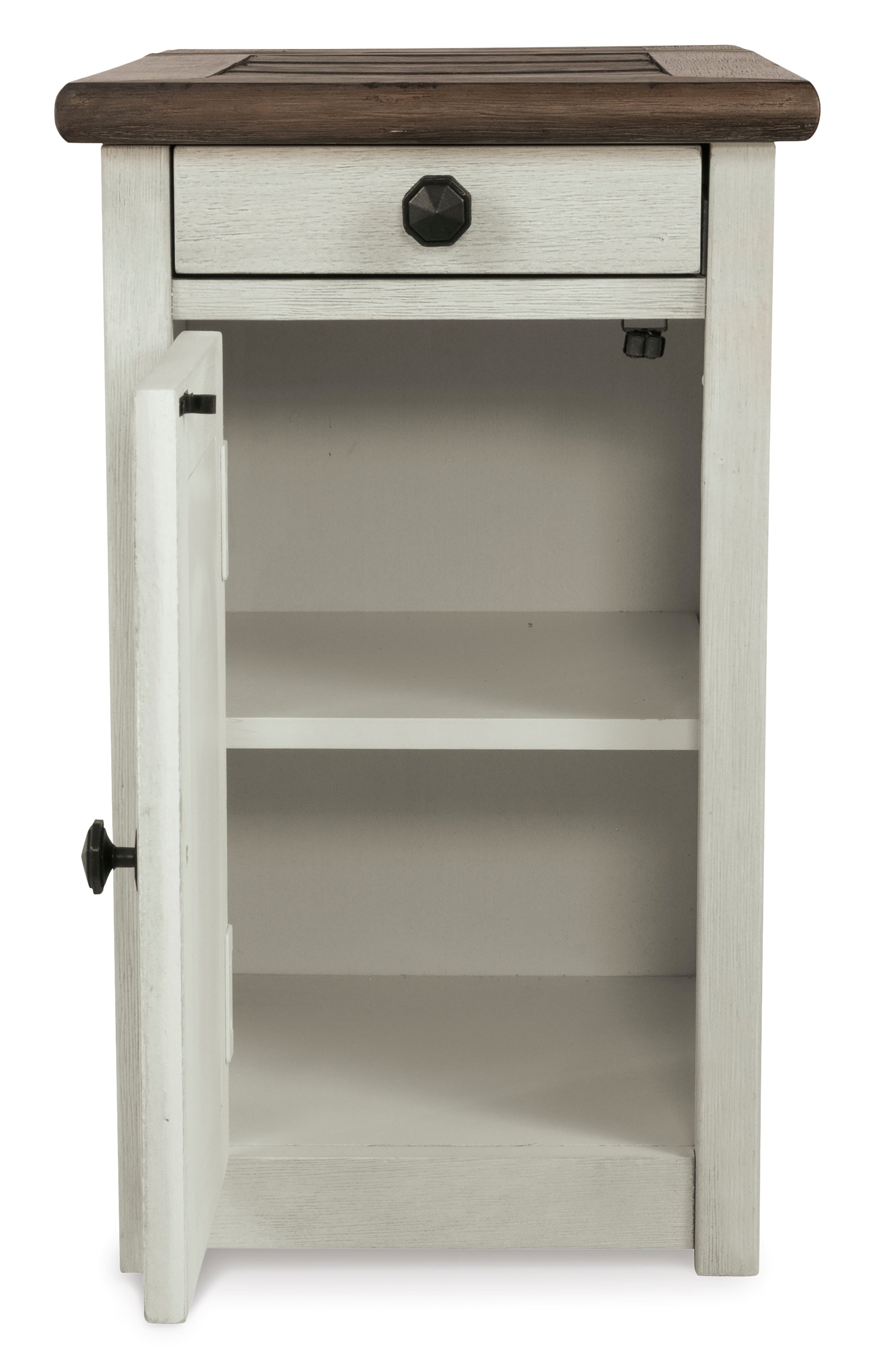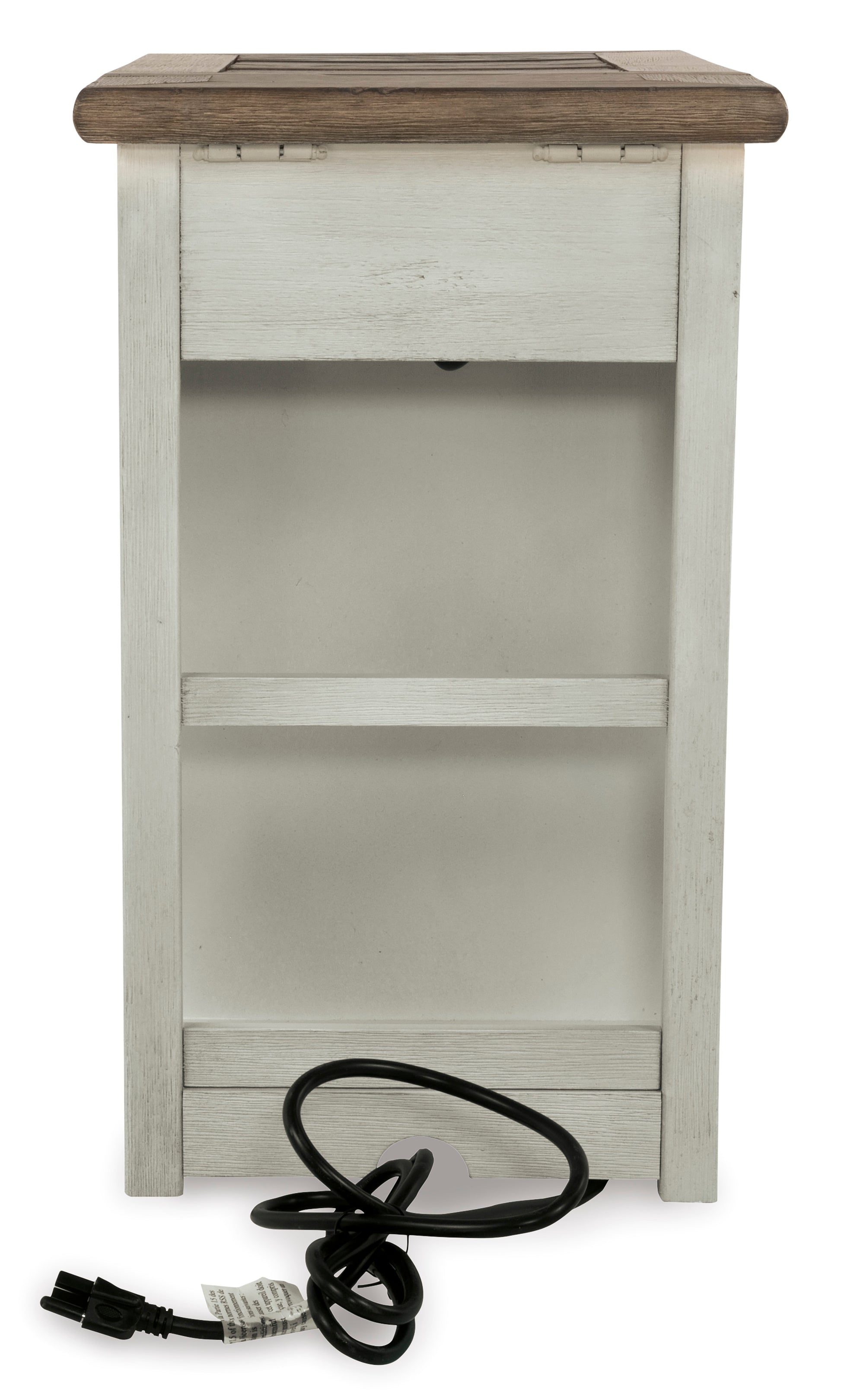 • Display and contain your favorite things with this end table. Its textured antique white finish creates a vintage two-tone look, while outlets and USB ports provide functionality. This is a piece you will enjoy for years to come.