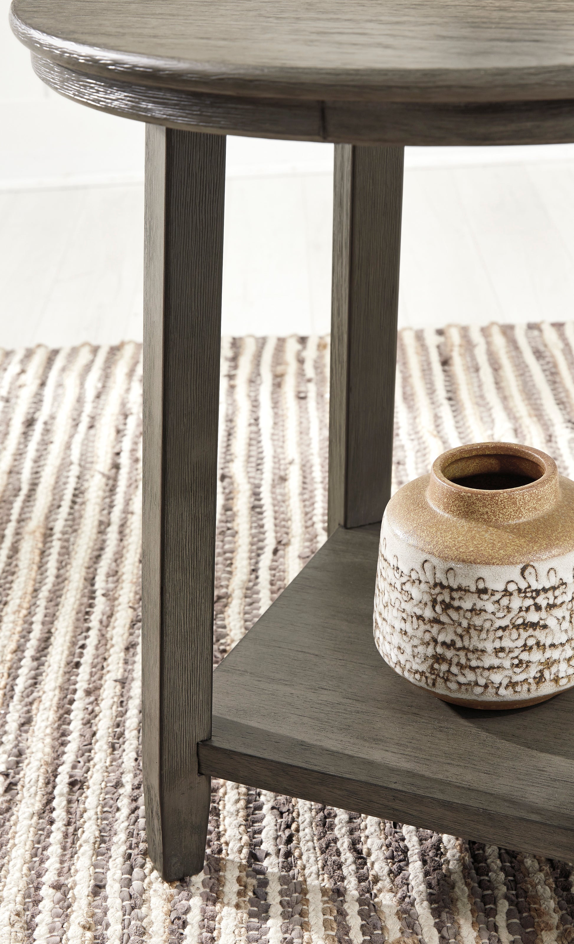 • Round out your seating area with this coffee table set in a contemporary two-tiered round design. Clean-lined design is simple, yet striking—while its antiqued gray washed finish over Acacia wood and veneer is anything but ordinary.