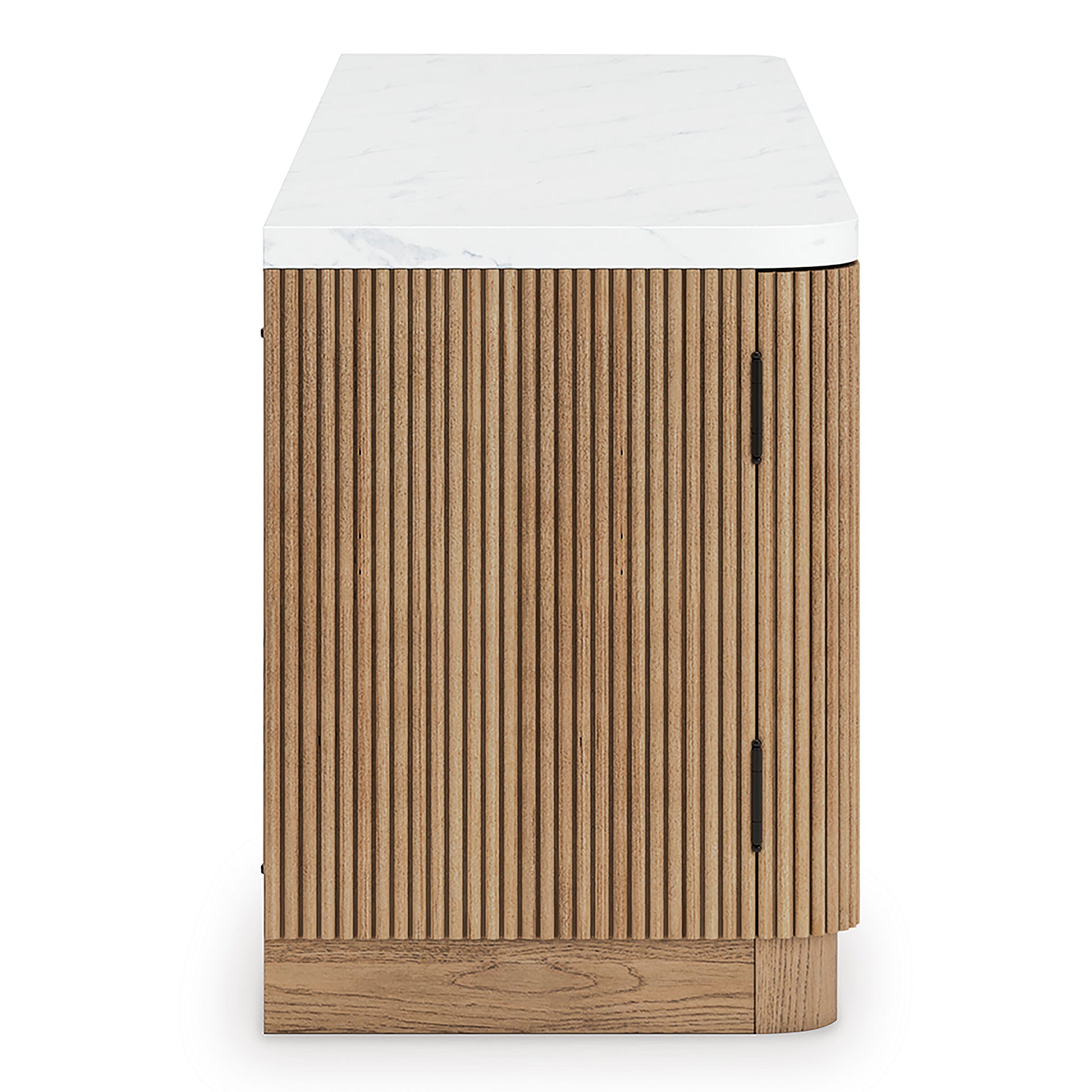 • Elegance meets earthy charm in this TV stand. Crafting a contemporary living room? The faux marble top expertly pairs with the reeded base for a trend-right take on day-to-day function. Open shelving and subtly integrated storage cabinets make it easy to store and display media accessories in style.