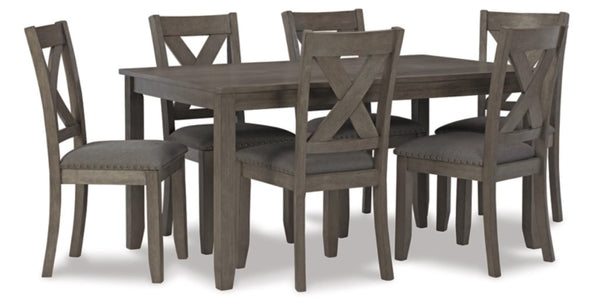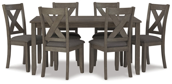 Perfect portion. Striking a simply chic pose, this dining set is styled with fascinating flair. Subtle gray wash finish gives the clean-lined design a casually cool sensibility, while the chair’s plushly cushioned seat in a soft, neutral upholstery adds to the allure.