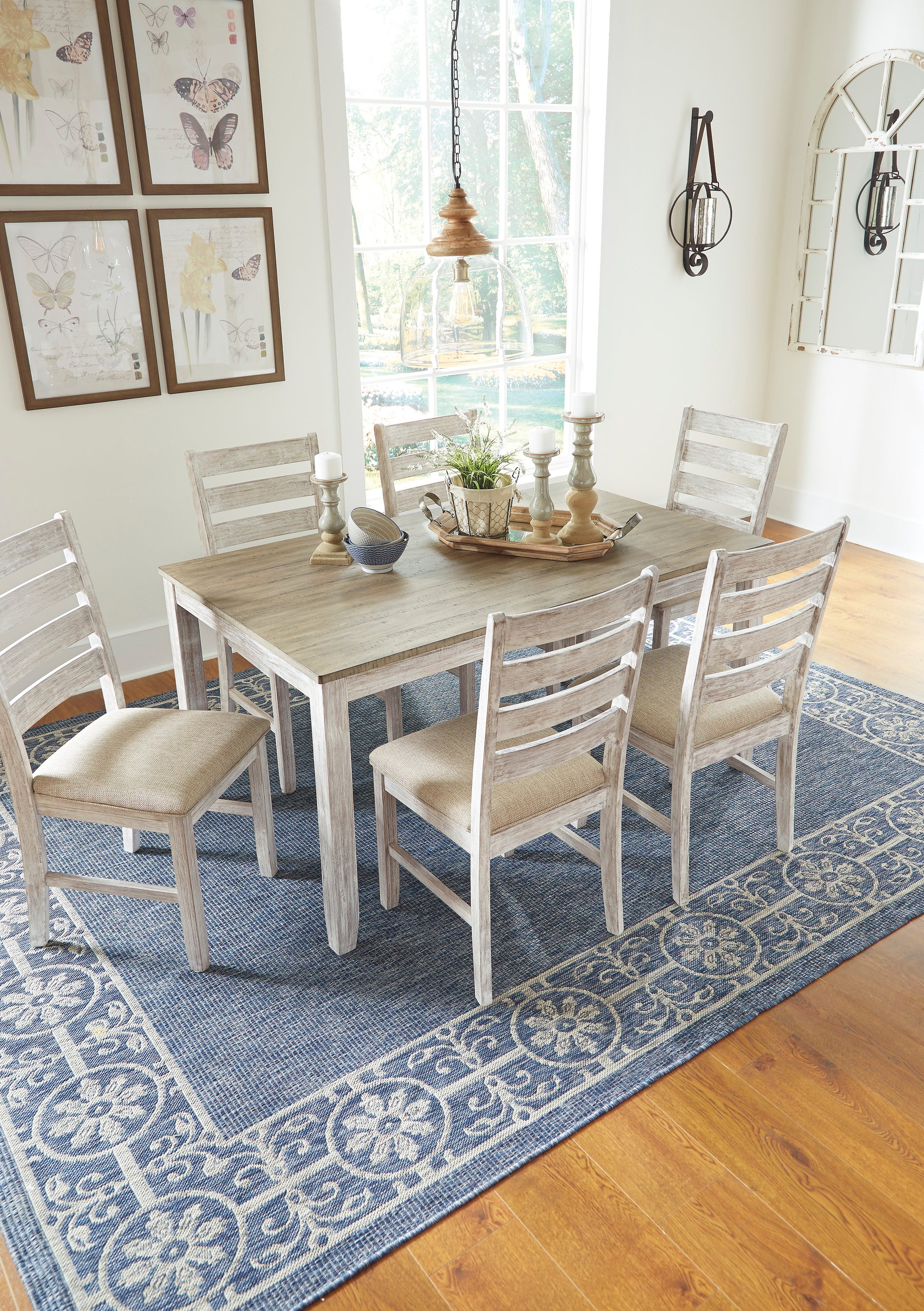 • Set the scene for coastal chic or modern farmhouse living with the Skempton dining room table set. Clean-lined, simply striking table doubles the charm with a brown tone top with plank effect, paired with a grayish white base with rub through effect for timeworn appeal. Six chairs with classic ladderback styling and comfortably upholstered seats make room for one and all.