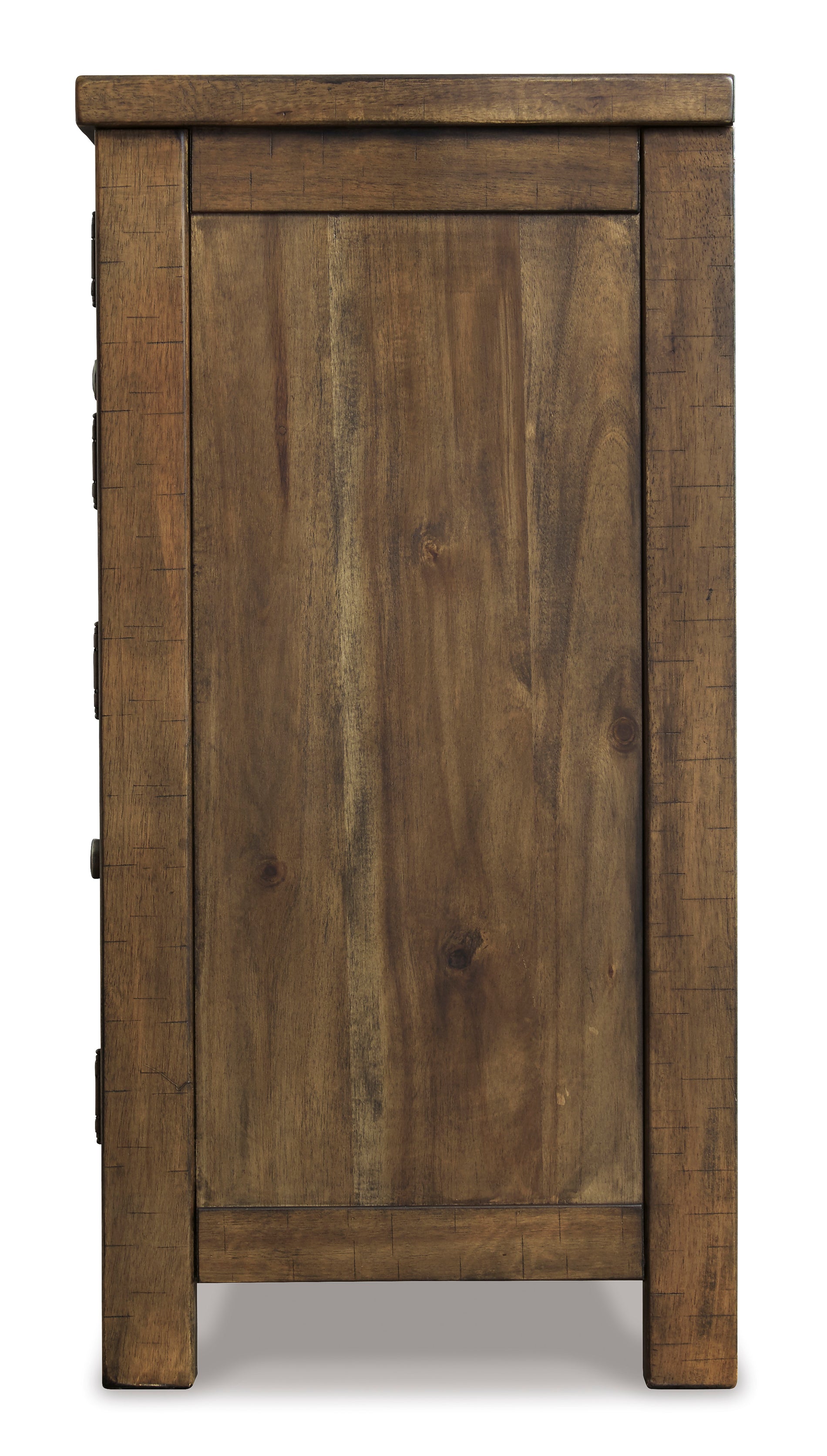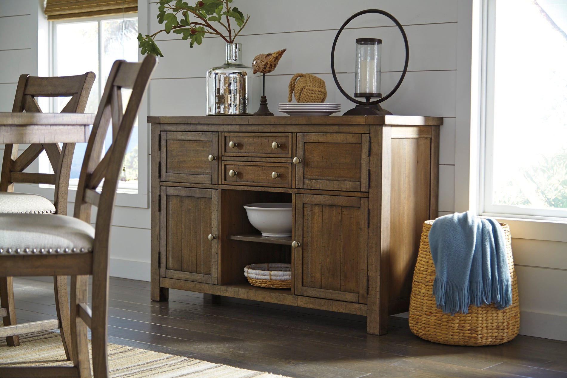 Moriville dining room server might be simple at first sight, but a closer look reveals beauty in the details. With the plank-effect cabinet doors and table top, distressed nutmeg finish and antiqued bronze-tone hardware, it’s simply beaming with charm. With a mix of drawer, cabinet and shelf space, this server will serve you well for years to come.