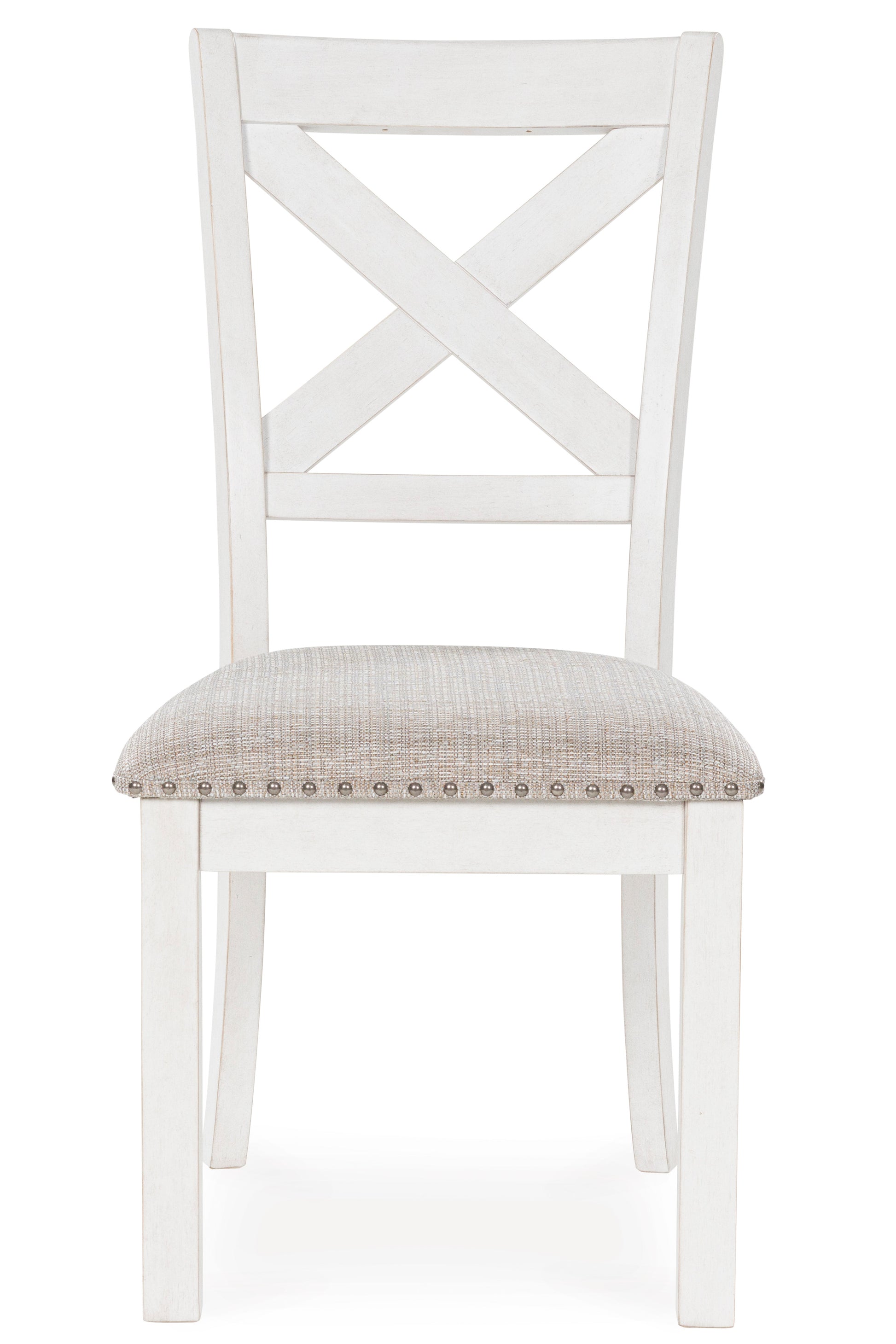 • This dining chair is sure to impress come mealtime. With its antiqued white finish, classic country X-back and light gray upholstery with nailhead trim, modern farmhouse-style dining has never been so fashionable. All that's missing is you and your family.