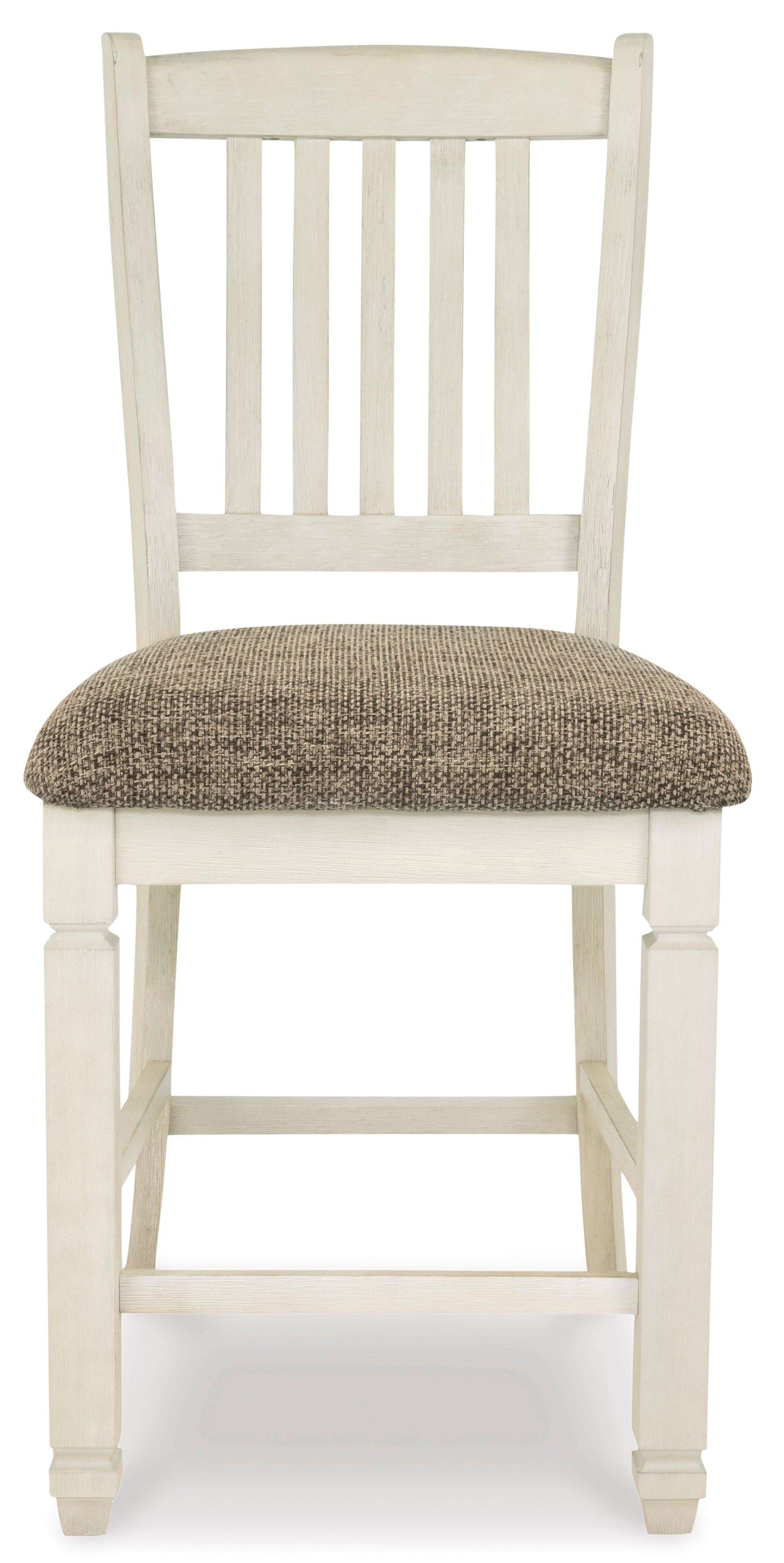 • The beauty of the Bolanburg upholstered bar stool is something to savor. Designed to serve up comfort and flair, this rake-back bar stool entices with a cushioned seat covered in a heavy woven fabric that complements the antiqued white finish.