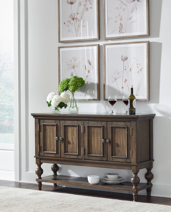 For those who appreciate a traditional aesthetic with understated elegance, this dining server brings home a feast for the senses. Its rich brown walnut finish merges seamlessly with a profiled top and baluster turned legs for a richly classic appeal. Thanks to its versatile functionality, this piece effortlessly works as a sideboard, TV stand or entryway table. What a deliciously timeless choice.