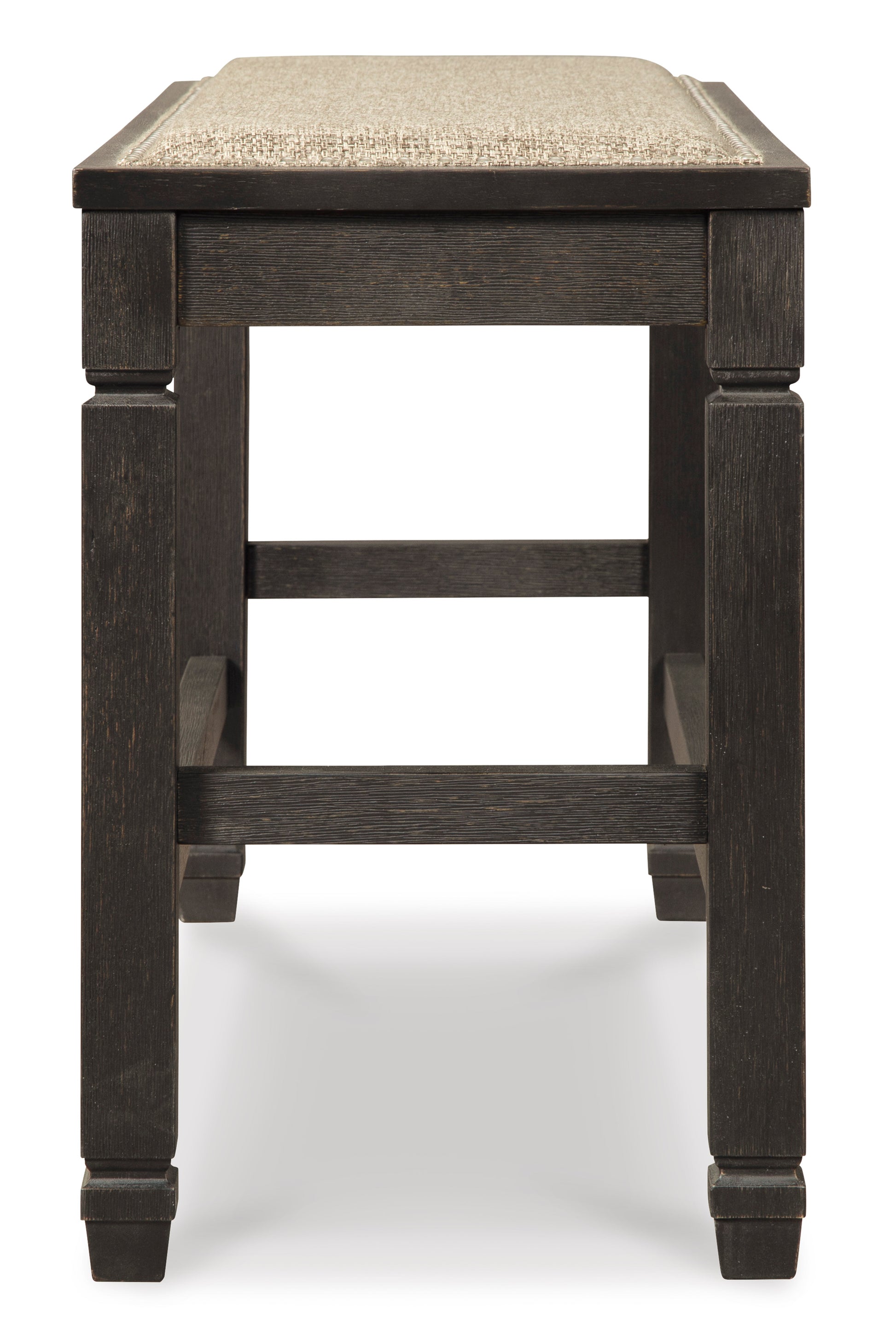 • Invite your family into the heart of your home with the Tyler Creek upholstered dining room bench. Tapered legs are a sturdy foundation, while the counter-height design raises the bar on fine dining. Textured black finish and heavy woven neutral upholstery accented with silvertone nailhead trim is trend-right urban farmhouse style without all the fuss.