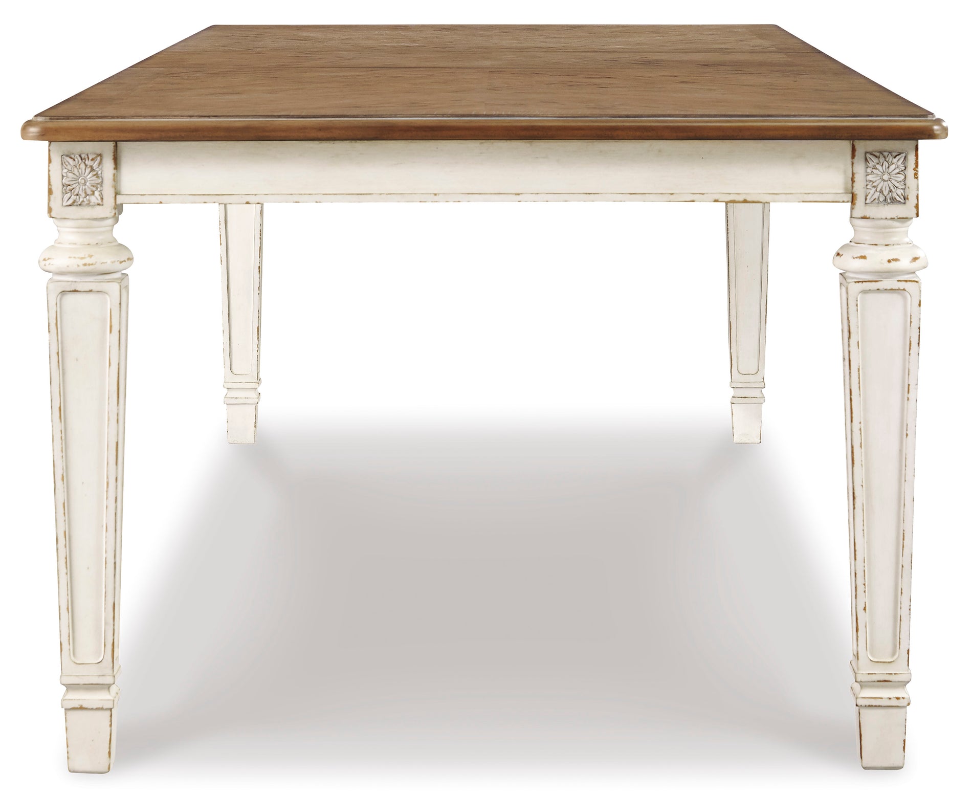Bon appétit. The Realyn dining room extension table has all the right ingredients for a French country-inspired feast for the eyes. Antiqued two-tone aesthetic pairs a chipped white with a distressed wood finished top for a double serving of charm. Drop-in leaf allows you to comfortably accommodate eight.