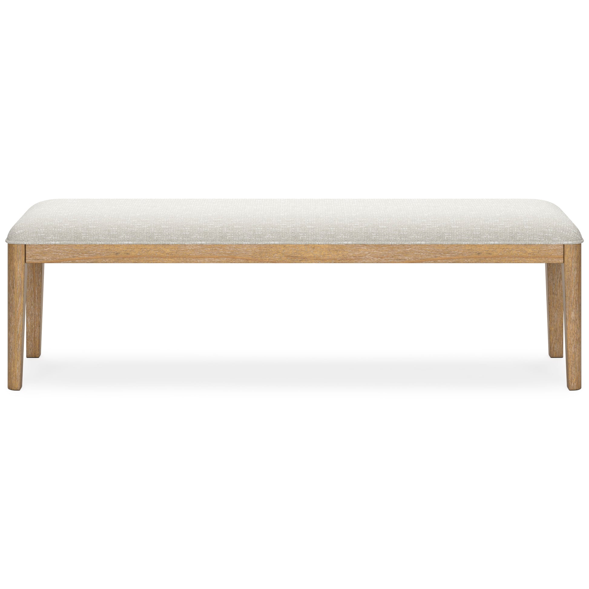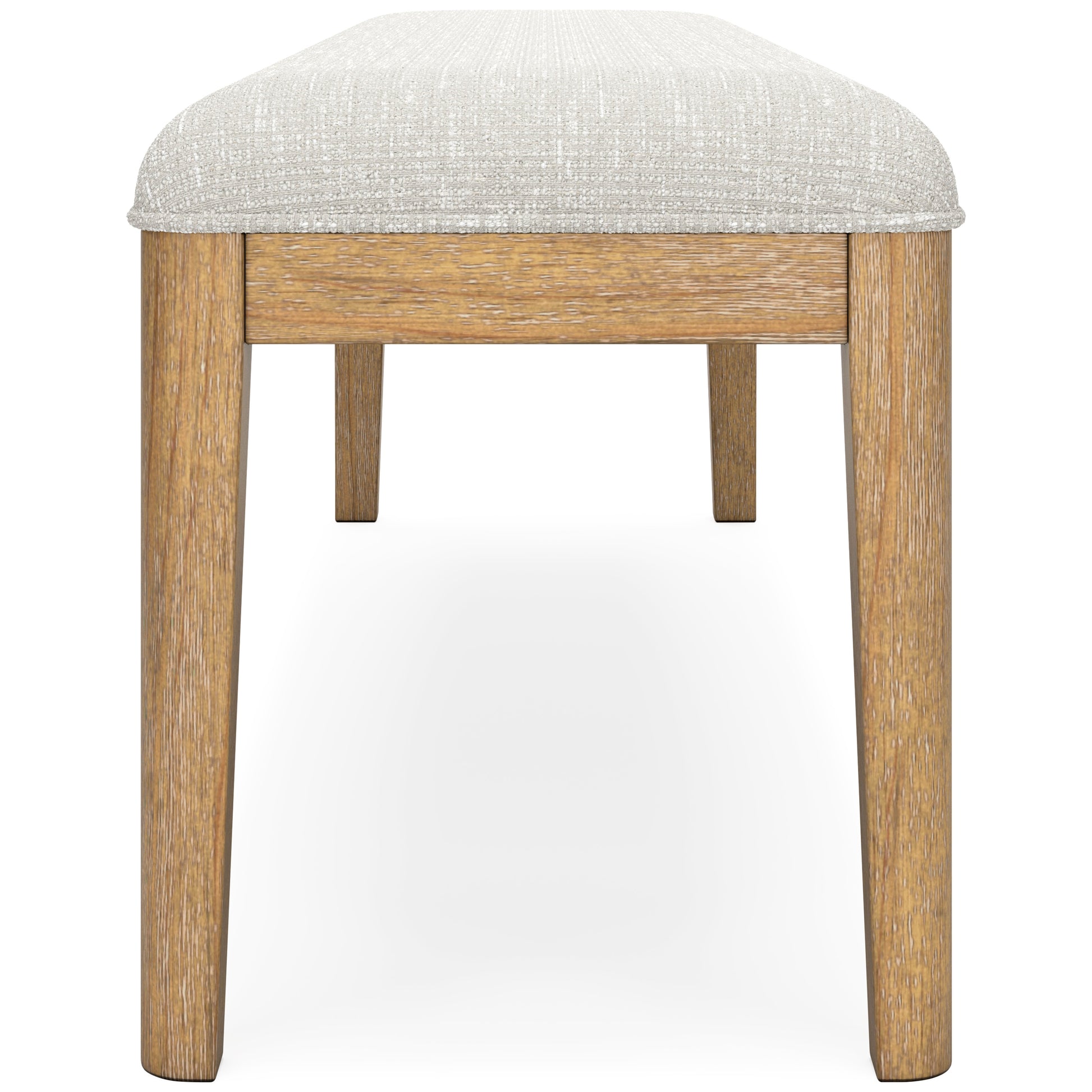 • This dining bench's classic yet contemporary good looks are hard to deny. Its softly cushioned seat in a woven fabric adds a comfortably cozy dimension to everyday seating or when guests gather. With a light oak finish and wire-brushed wood grain texture, this bench lends an organic appeal to your delicious dining space ... or wherever family and guests gather.