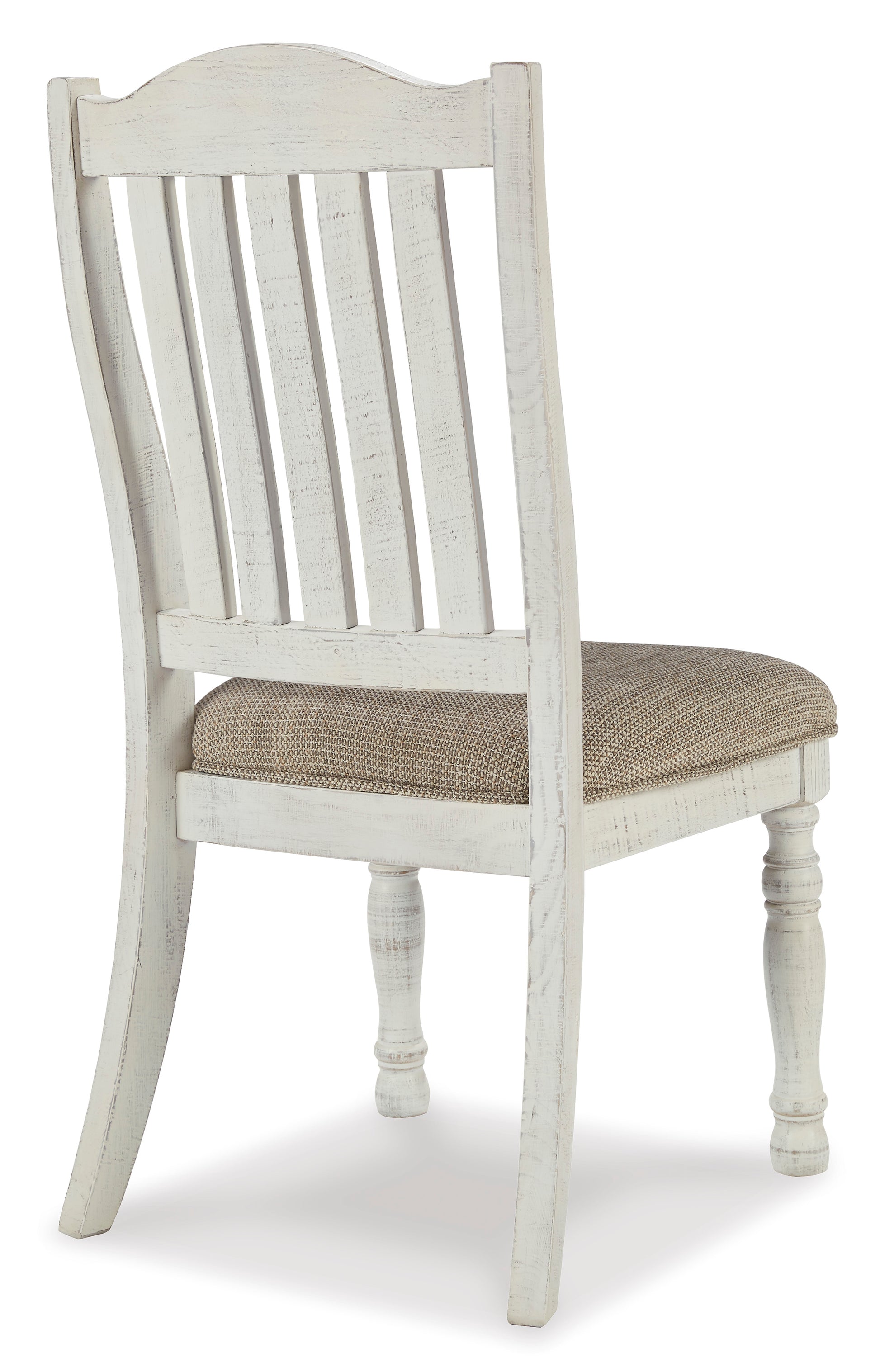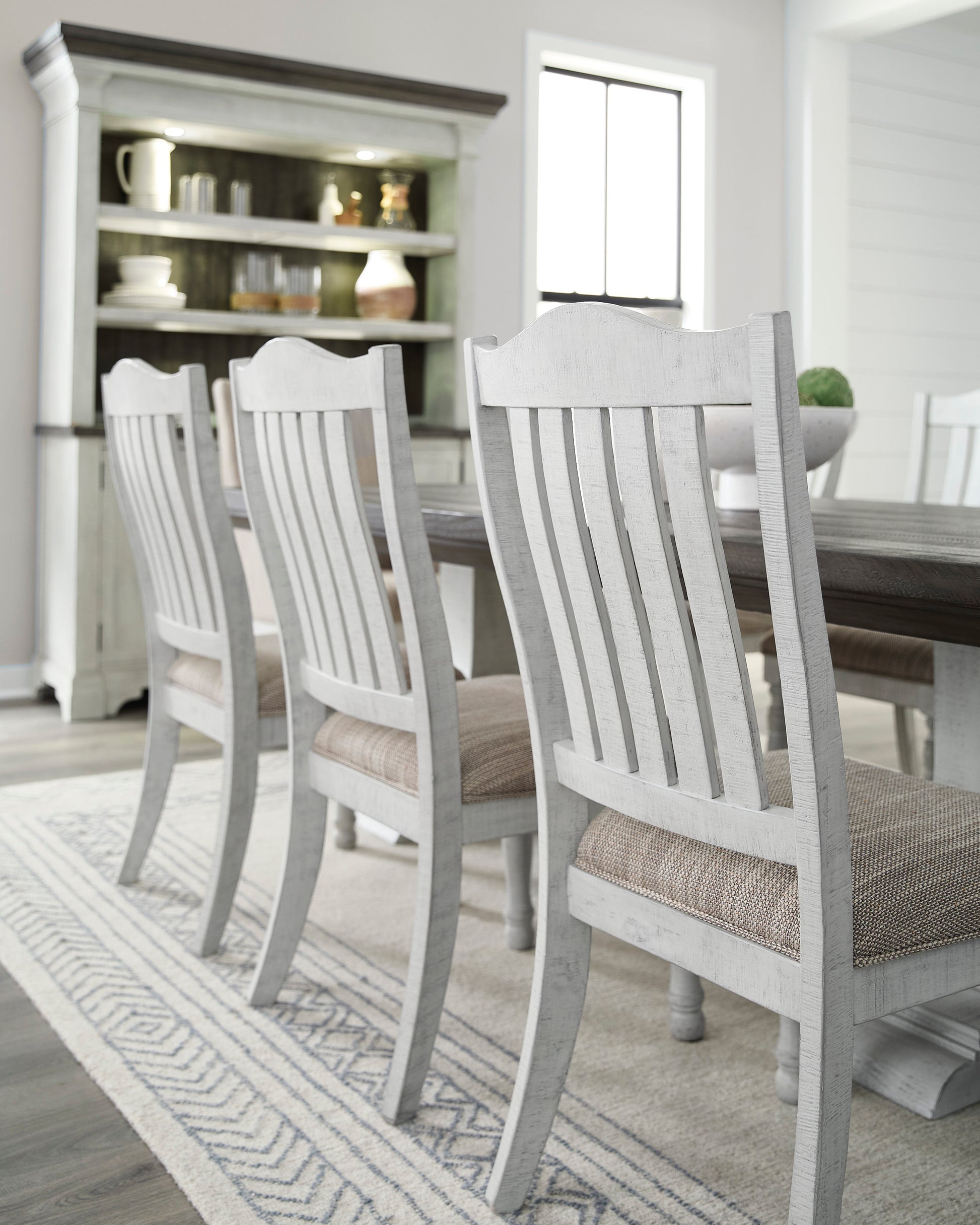 • Have your fill of modern farmhouse style with the Havalance upholstered dining chair. Distressed vintage white finish is utterly charming. Bent slat back design and cushioned upholstered seat with woven oatmeal-tone fabric cater with beauty and comfort.