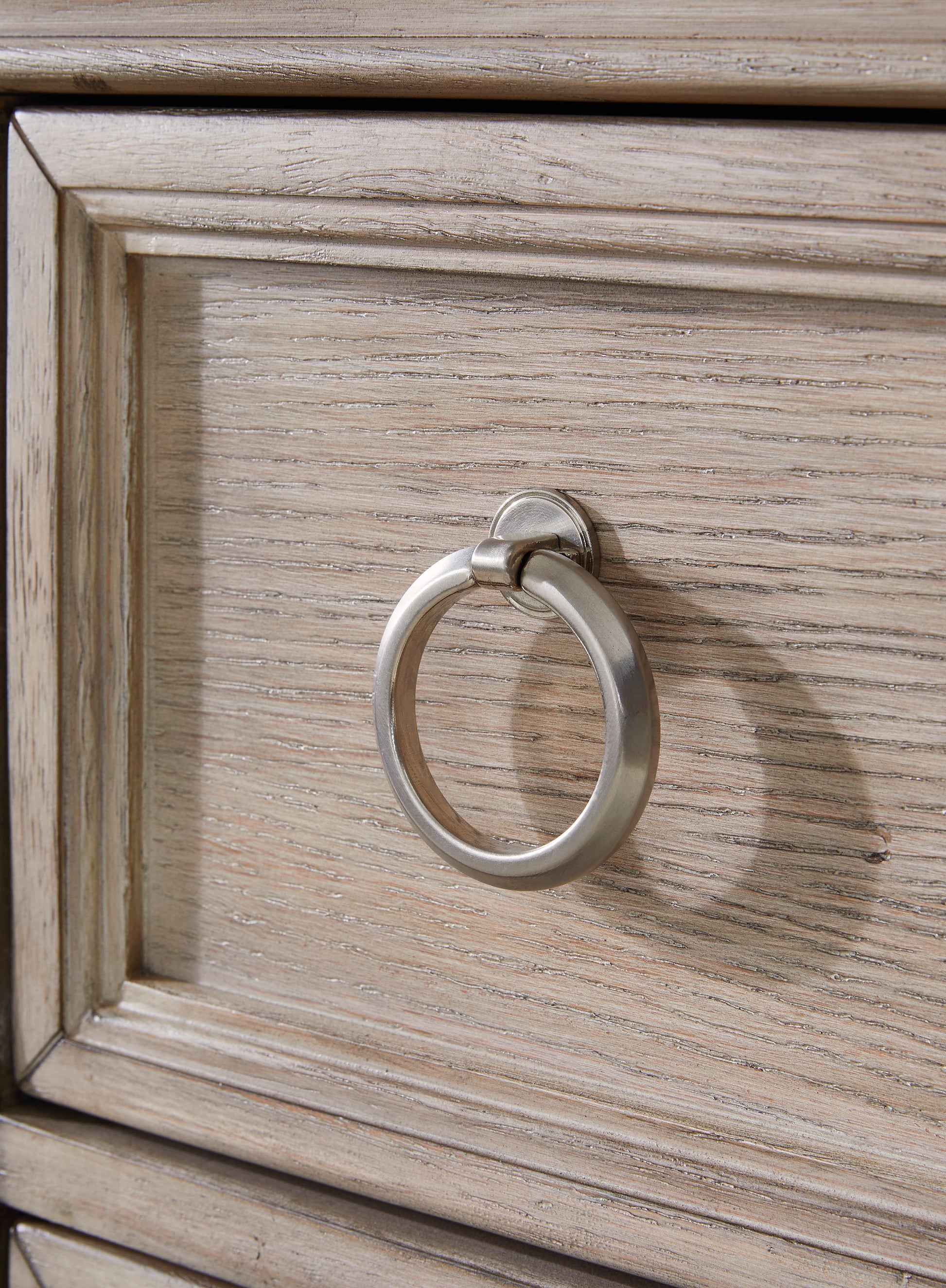 • Drawers with satin nickel-tone ring pulls; doors with round satin nickel-tone knobs