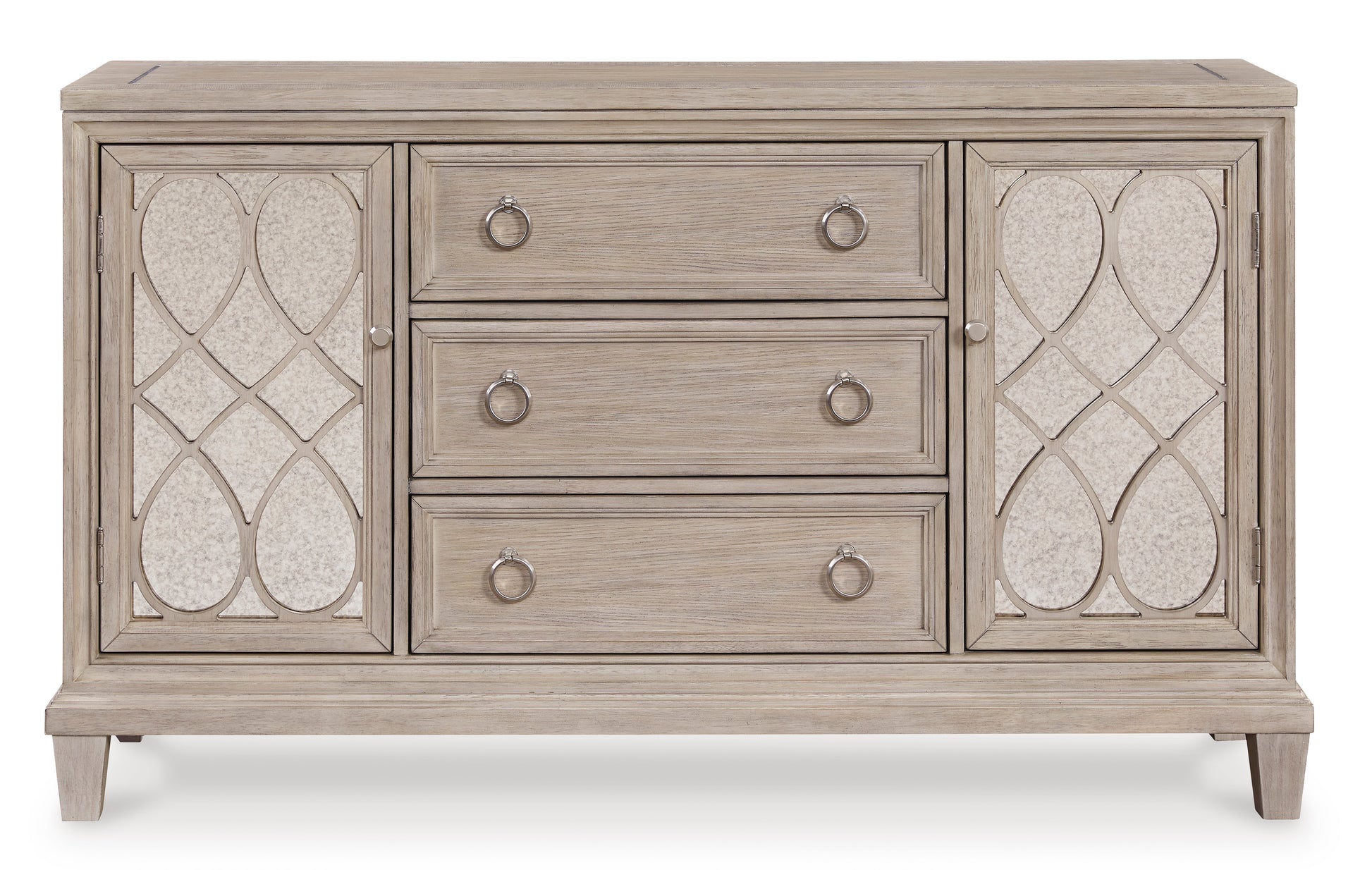 • This striking dining server is equally at home in traditional or modern settings. A rich layered gray finish enhances the wood grain colors for a modern look. Two delicious doors and spacious drawers for essentials feature picture frame moulding for a clean yet sophisticated design. Decorative fretwork and antiqued mirror door panels make for a tastefully traditional touch in a dining room or entryway.