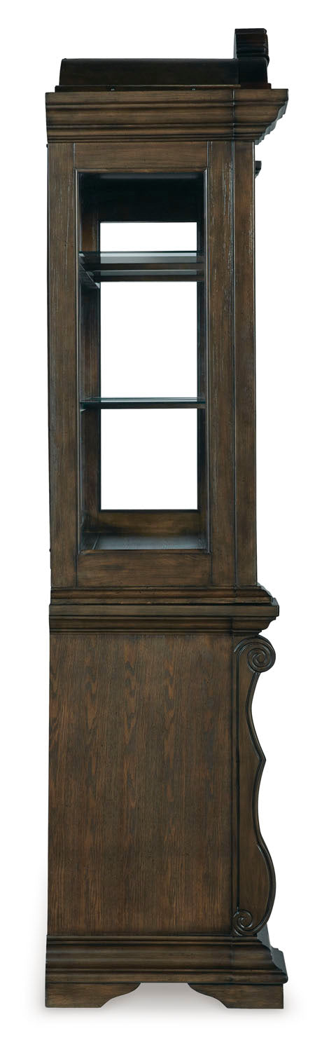 • From its ornamental appliques to its large scale, this dining buffet with hutch makes a bold statement. With decorative pilasters, beveled glass windows and plenty of storage, the opulent piece wows with stunning style. The look is timeless. The feel? Right at home.