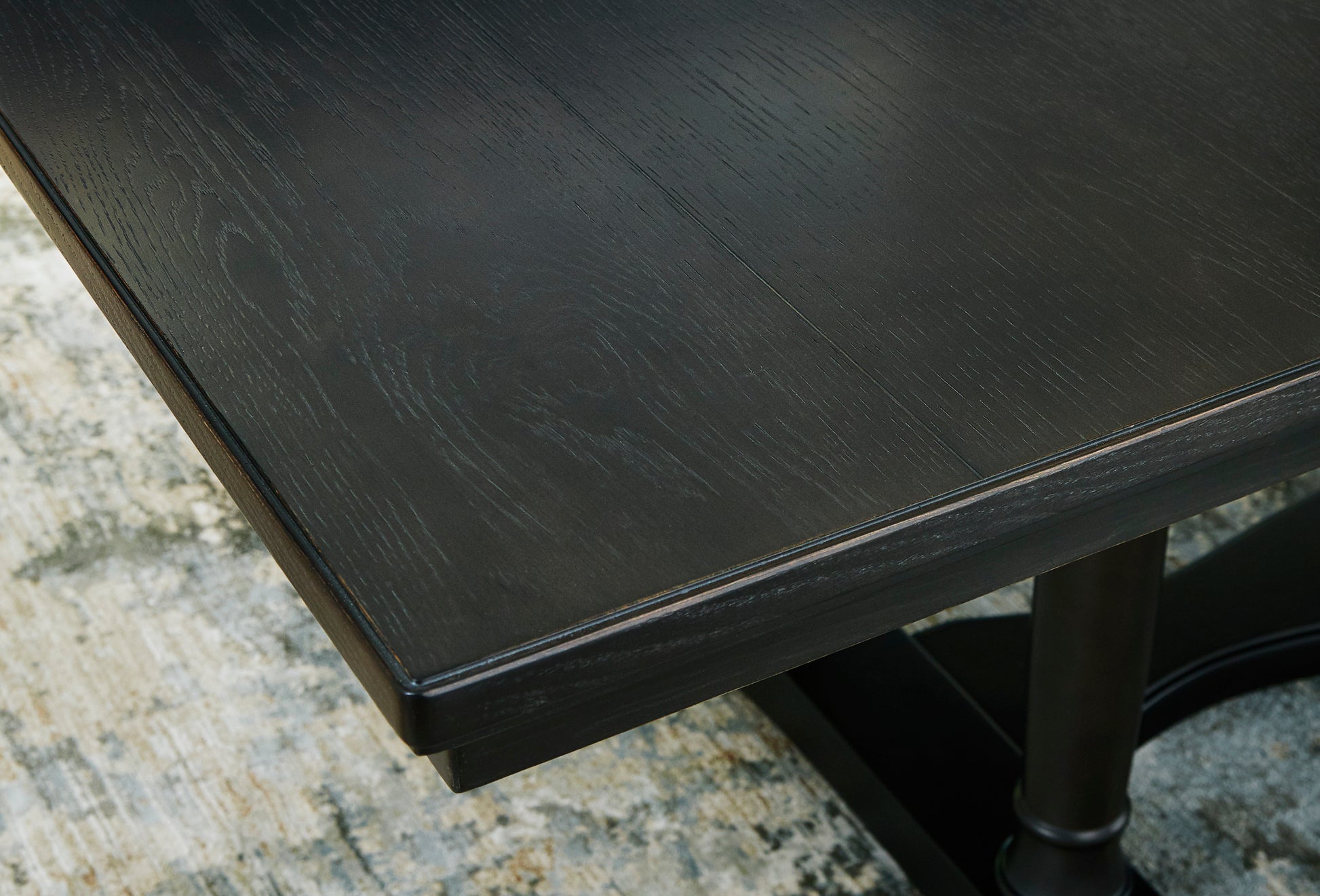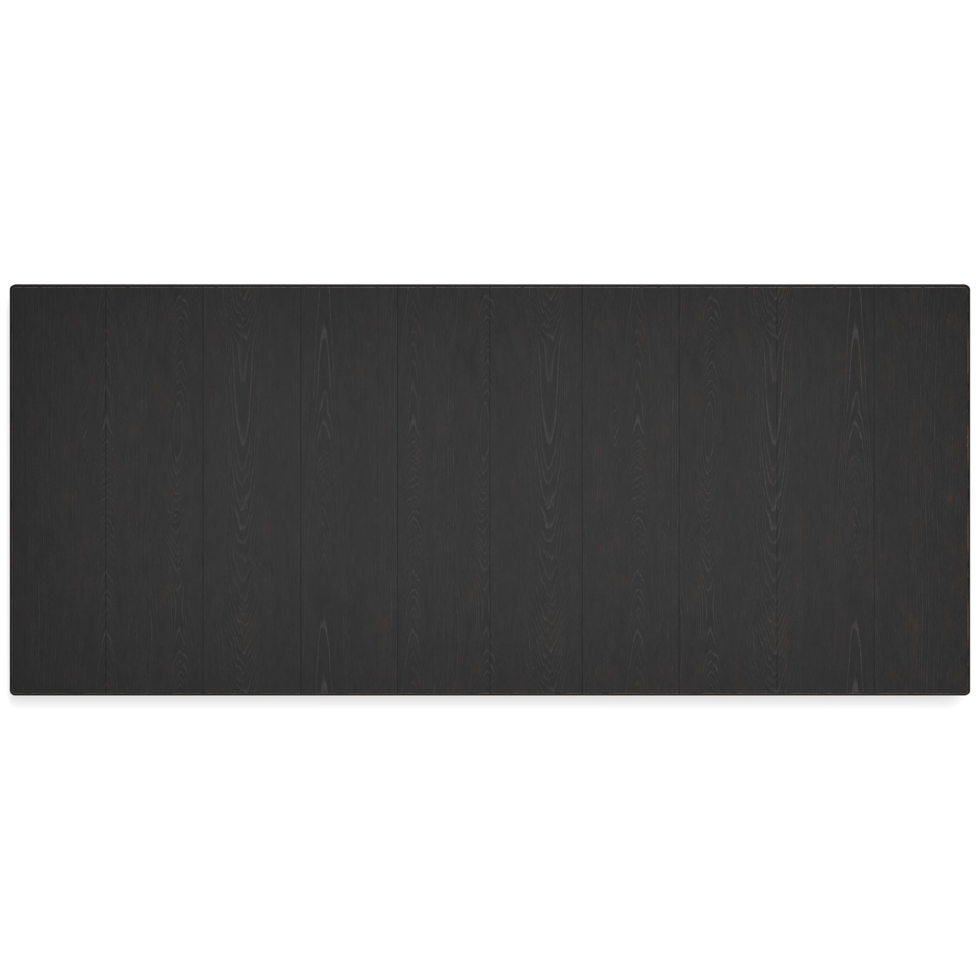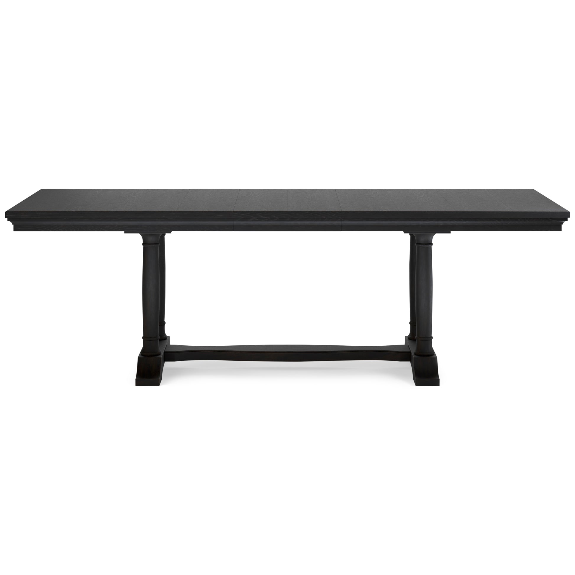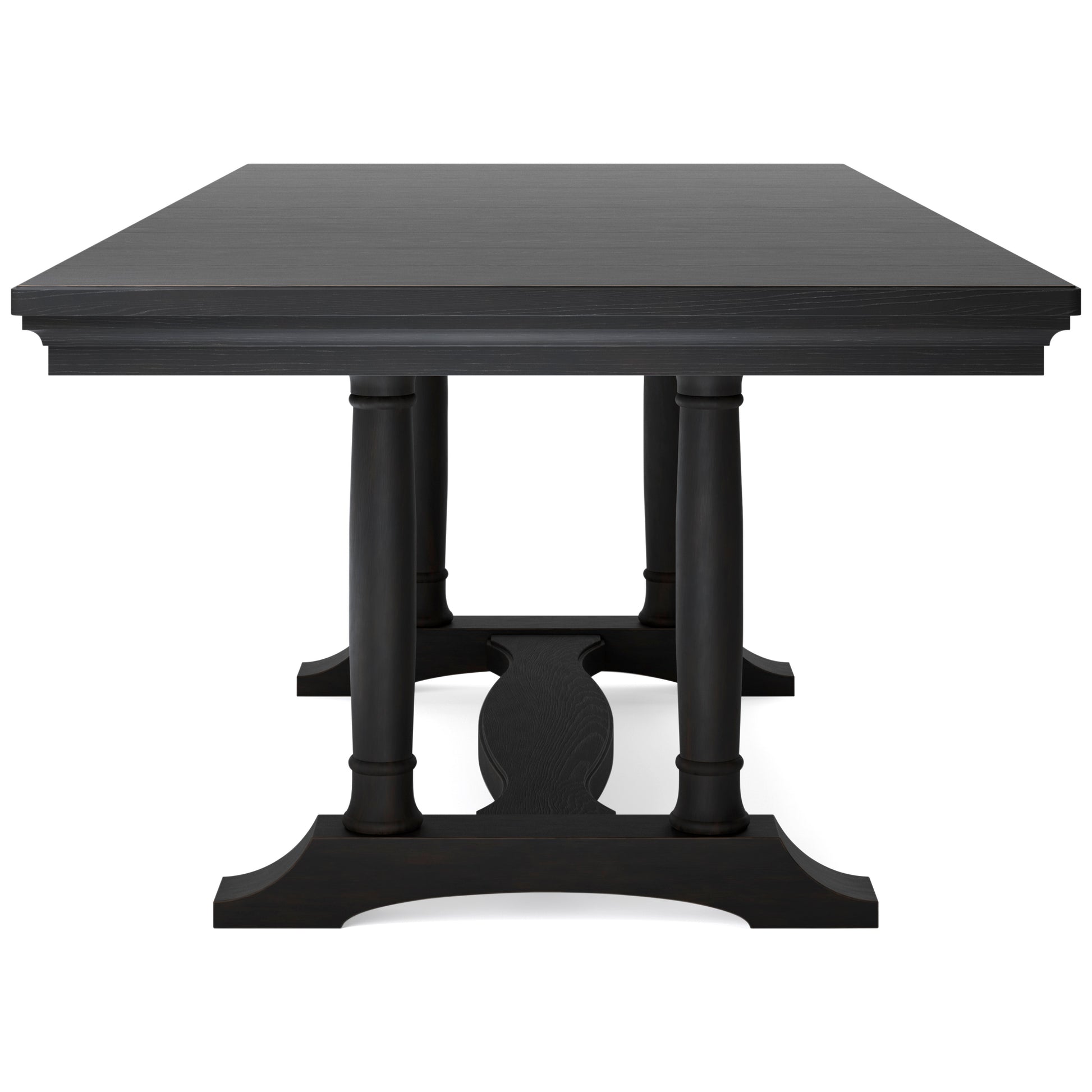 • For those who love the classic profiles of traditional design—but want to forego the overly formal details—behold this dining extension table. A rich layered black finish offers a subtle sense of gently aged charm, while the stylish double trestle base adds a distinctive touch. The extension leaf means there's always room for more guests to linger longer. What a delicious take on urban revival design.