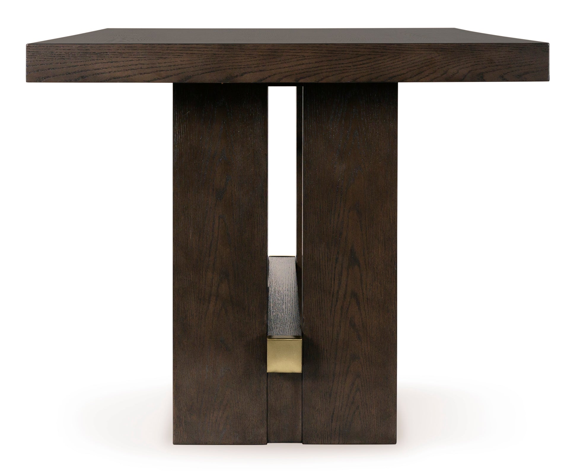 • Dressed to thrill, this counter height dining table offers a high-design look at a down-to-earth price. Ultra-sleek lines are accentuated with a dark waxy brown oak-tone finish that’s so easy on the eyes. A thick tabletop and a pedestal base with integrated wine rack showcase quality craftsmanship and attention to detail. Clean-lined and modern, this timeless table has a look that’s made to last.