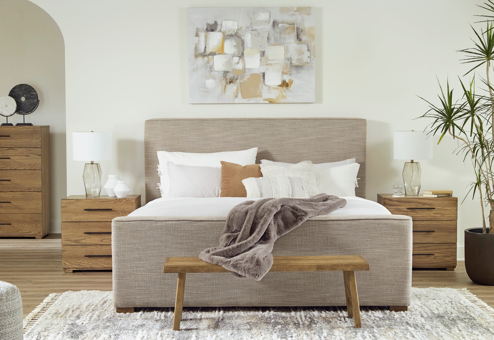 • Taking an organic approach to a curated bedroom aesthetic, this warmly neutral king upholstered bed has a natural appeal. The clean-lined design is highlighted with an effortlessly beautiful linen-like upholstery. With its aura of casual refinement, this piece elevates the everyday in your restful retreat.