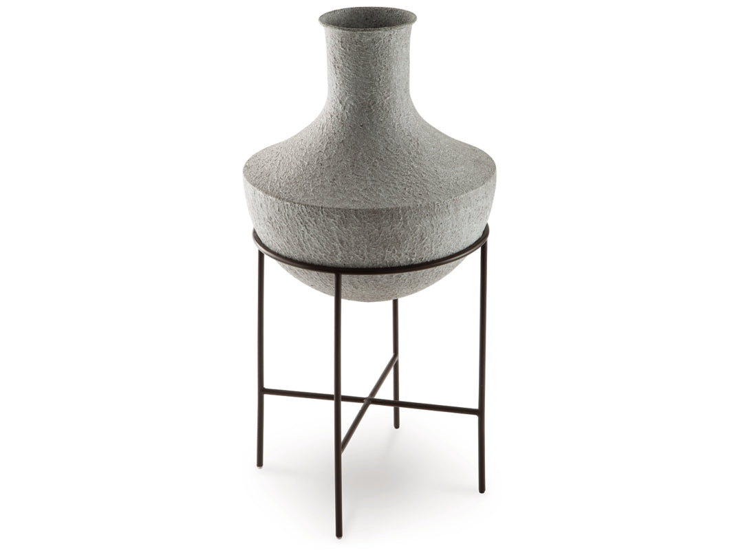 Take an effortlessly inviting approach to floor decor. The Estonbank vase's distressed, textured look in a neutral hue pairs with a variety of casual color palettes. An espresso brown stand adds charming contrast to the look. And this vase enthusiastically welcomes faux florals and filler, perfectly adapting to the seasons when you swap out your arrangements.