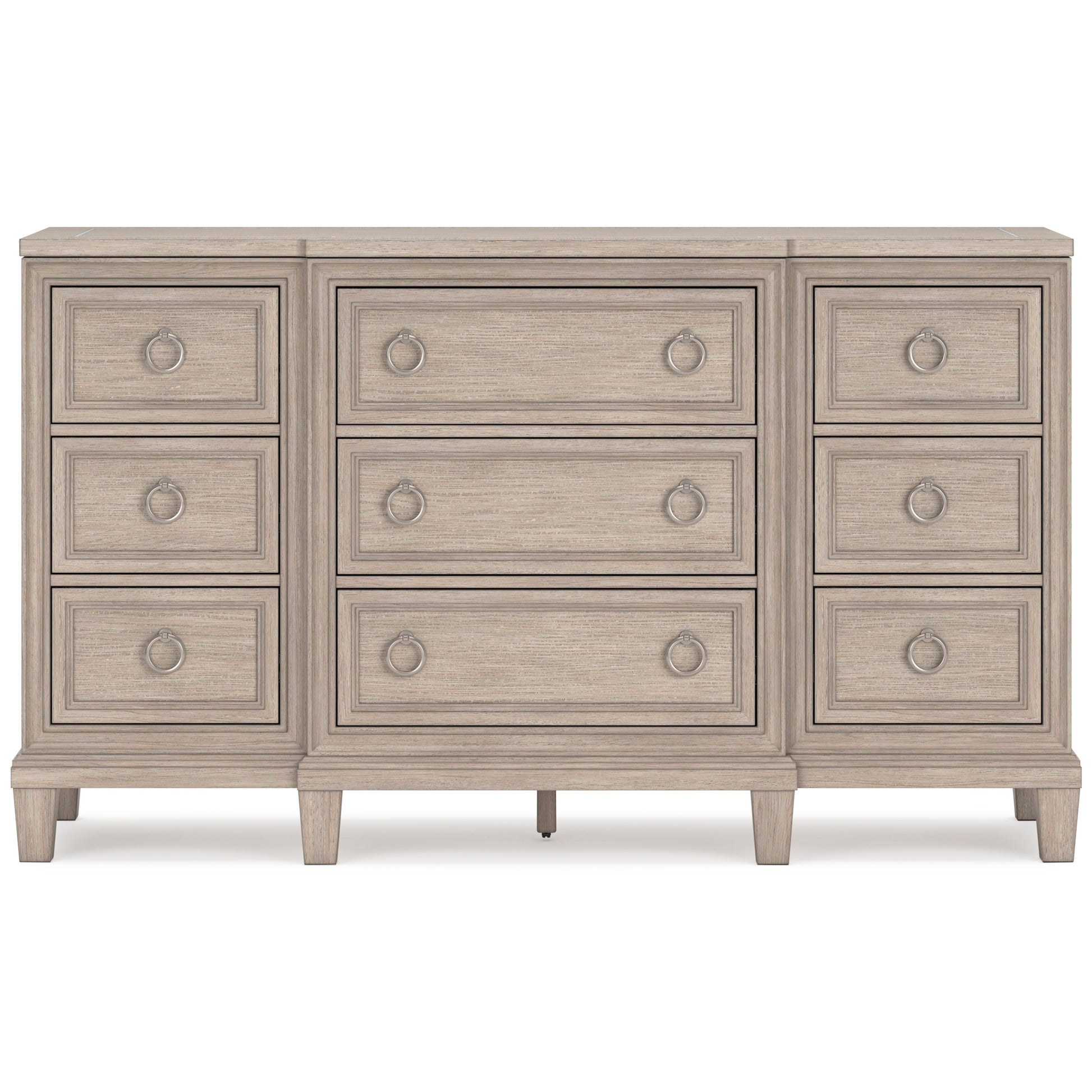 • This striking dresser looks equally at home in traditional or modern settings. A fresh light gray finish offers a casual modern look. Spacious drawers incorporate picture frame moulding and satin nickel-tone pulls for a clean yet sophisticated design. Combined with the top's chic inset metal frame, it's a wonderful style awakening in the bedroom.