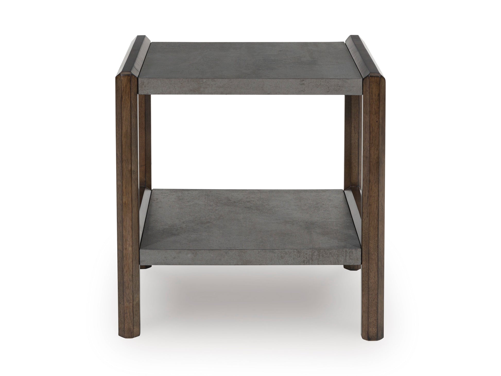 • Master the art of mixed-material design with this end table. Sporting an urban vibe, its faux cement lends an industrial edge to the contrasting dark brown finish. For a functional touch, a lower shelf showcases your decor in style. Detailed mouldings on the sides add that much more cool character.