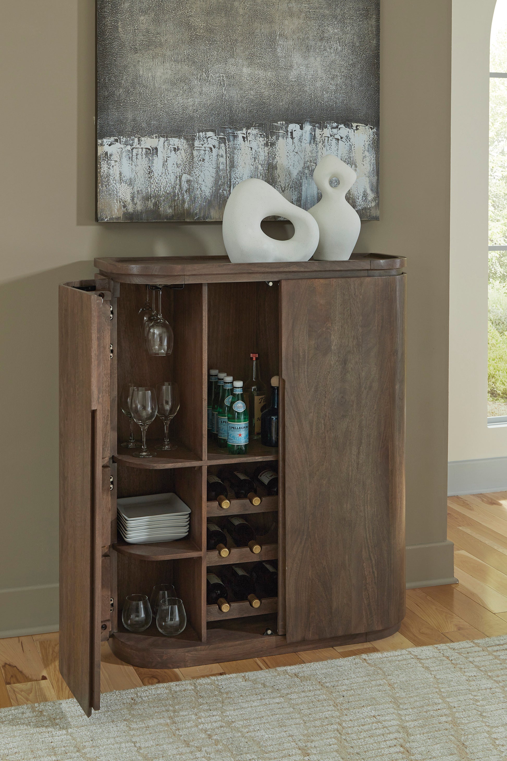 • This bar cabinet captures the essence of classic elegance while delivering on contemporary function. It's beautifully crafted from mango wood, with a medium brown finish bringing extra warmth to the ultra-modern silhouette. Want to drink in style? Bottle and glass holders keep wine-tasting essentials effortlessly organized. Ample shelving stores other must-haves for at-home mixology or hosting guests. And for a night-to-day transformation, this cabinet can also double as a chic coffee station.
