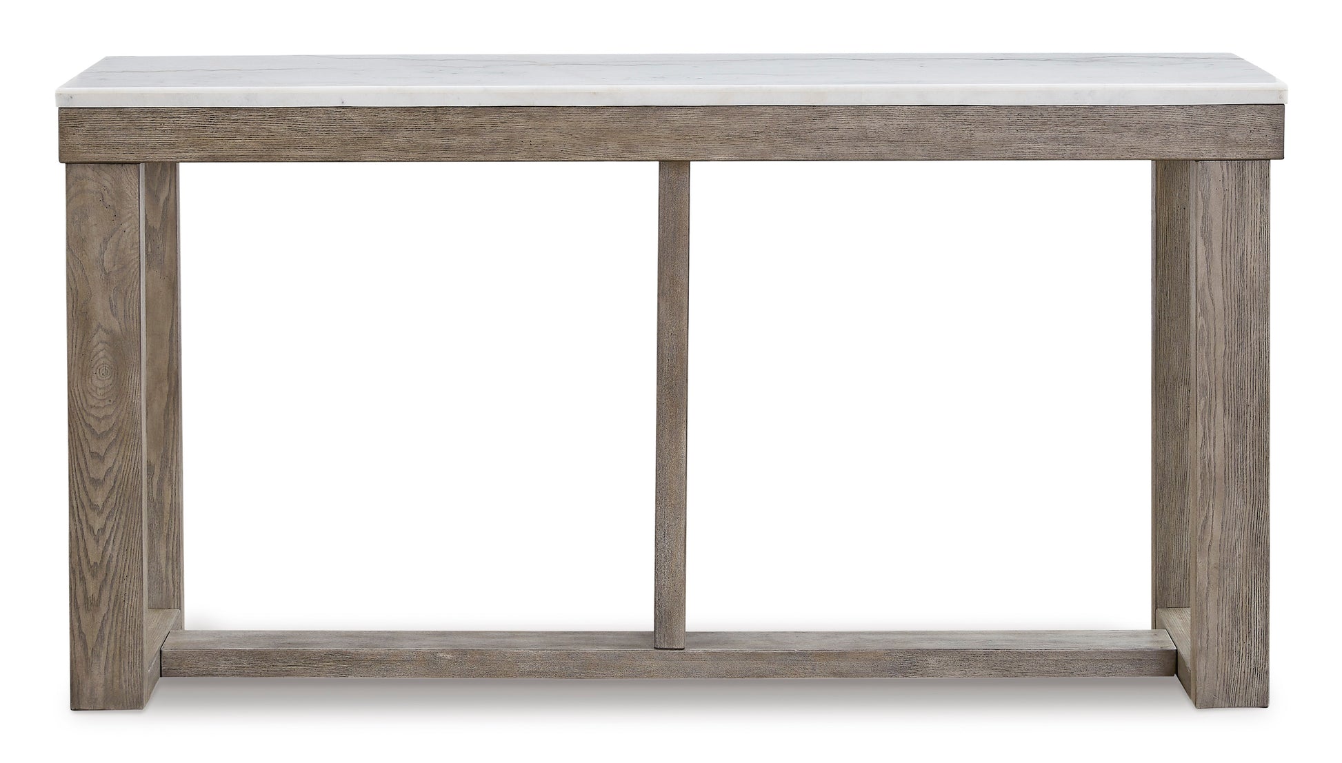 • This sofa table is simple in design but big on style. Finished with a trend-right grayish brown wood tone, its bold, blocky profile and natural marble top are timeless, classic choices. This table is ideal for pairing with an ottoman to pull extra seating into the room, or for remaining clean and sleek on its own.