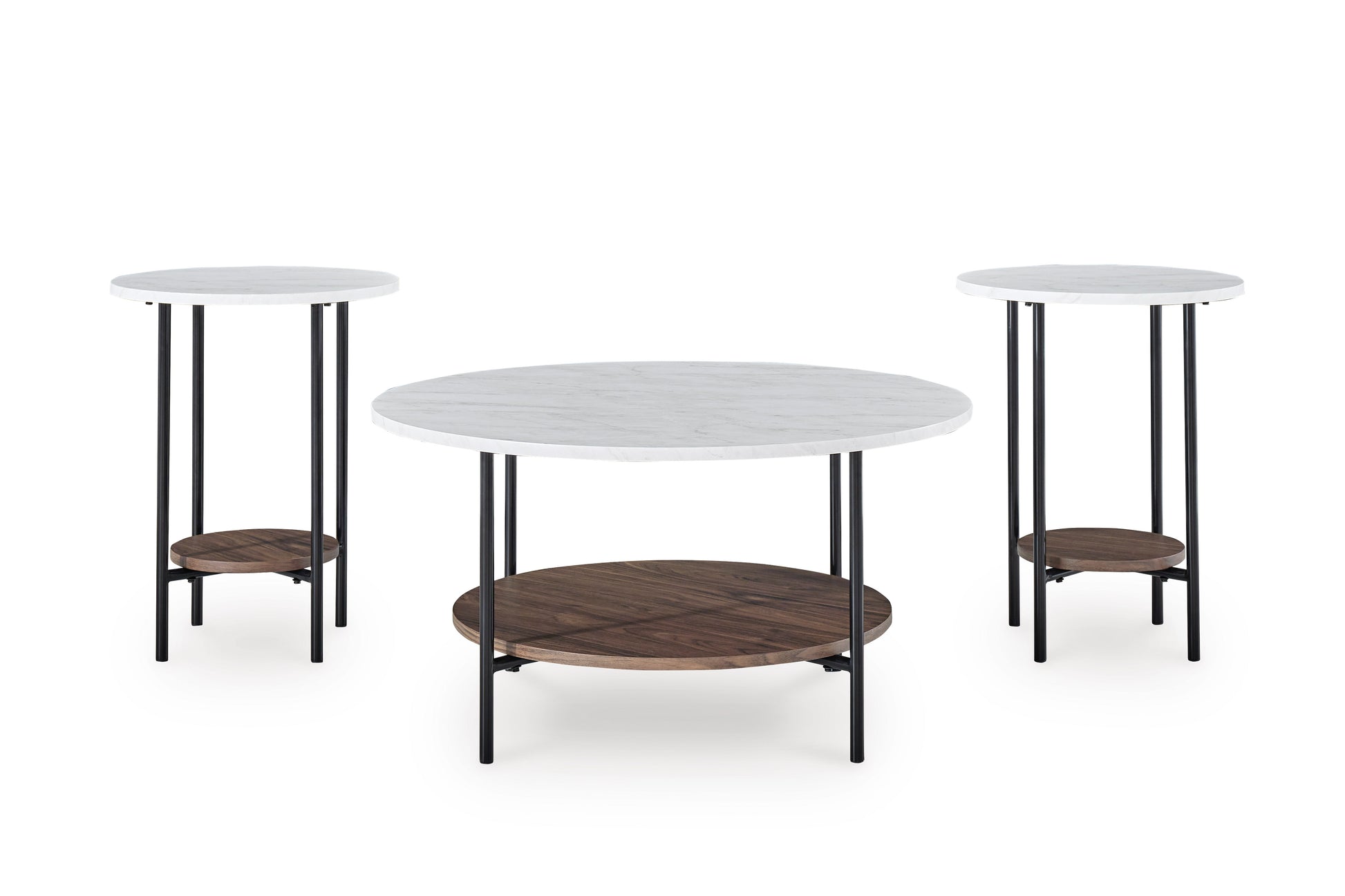 • Round out your seating area with this table set. The clean-lined profile is simple, yet striking while the faux Carrara marble tops are anything but ordinary. Black tubular metal frames, along with open storage shelves with a light natural wood grain pattern, work beautifully together from every angle.