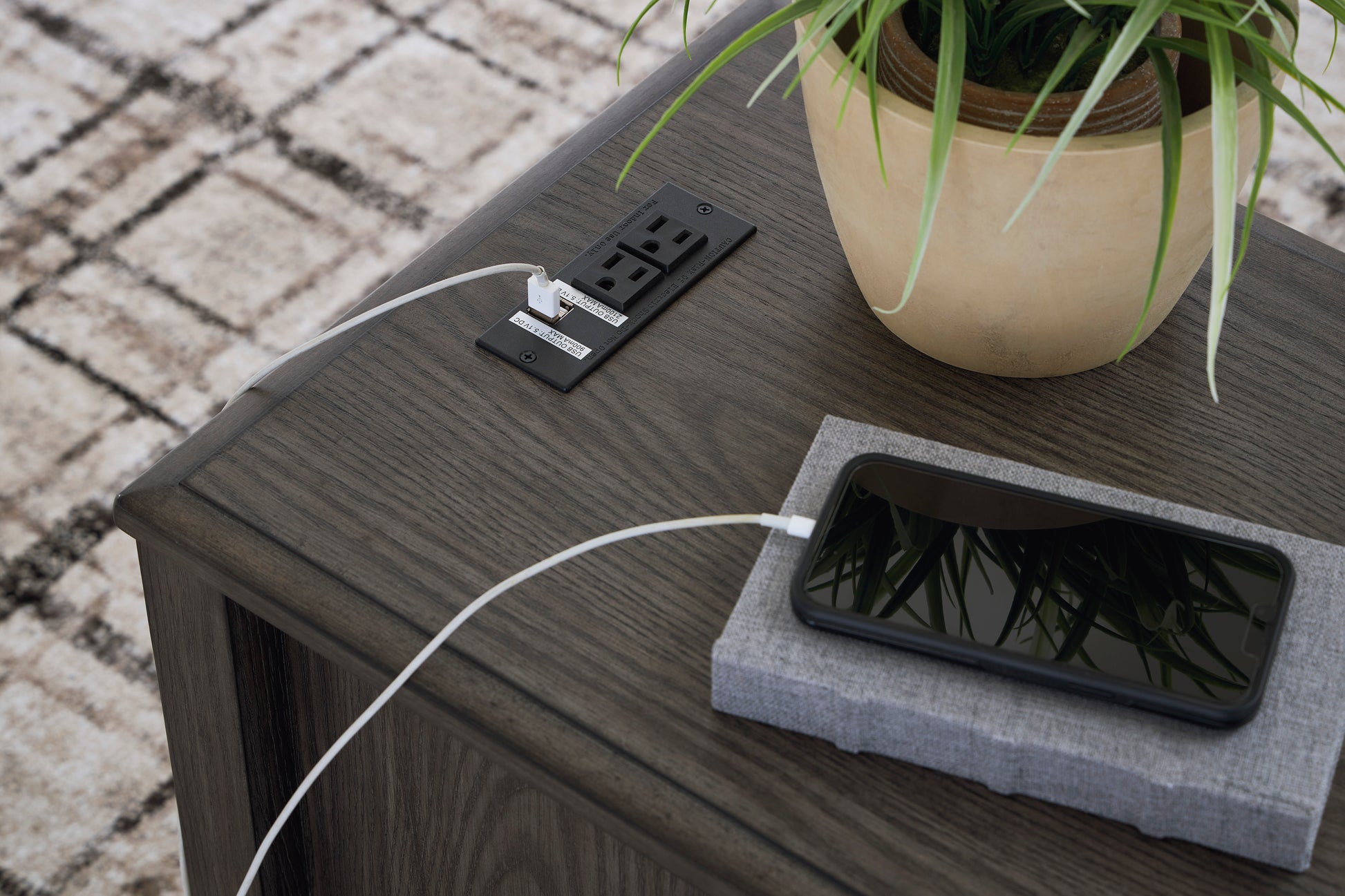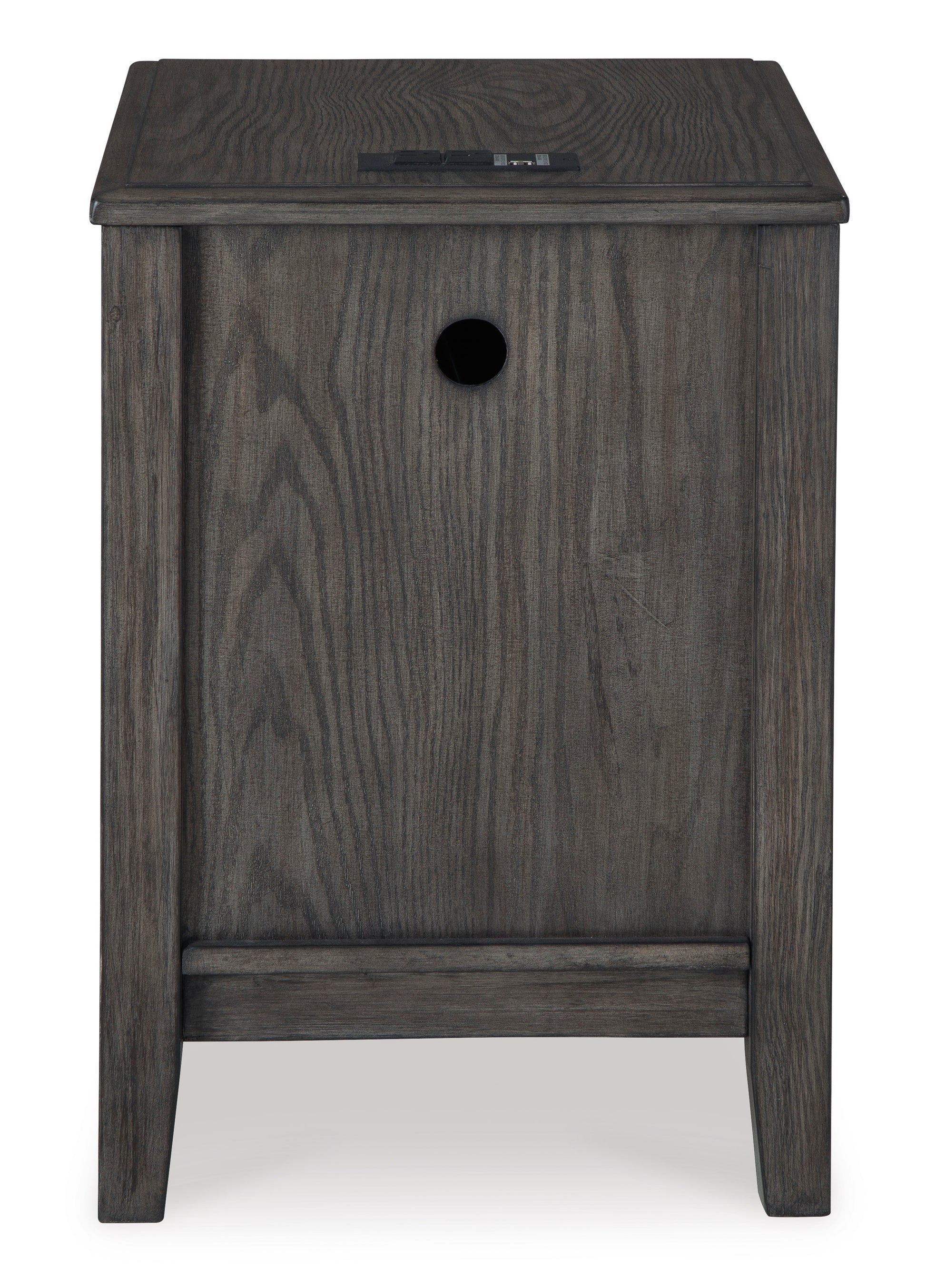 • Cool and clean, yet warm and inviting. This chairside end table has so many standout qualities, making it an inspired choice for your dream decor. A prime example of “casual contemporary” style at its very best, the designer piece is dressed to impress with an embossed wood grain texture. Its cabinet conceals a shelf ideal for storing smaller items like your e-reader, TV remotes and other seat-side must-haves. With convenient USB charging ports, devices can be charged without having to get up. And the medium gray-brown finish with a blackened wood grain contrast is wonderfully easy on the eyes.
