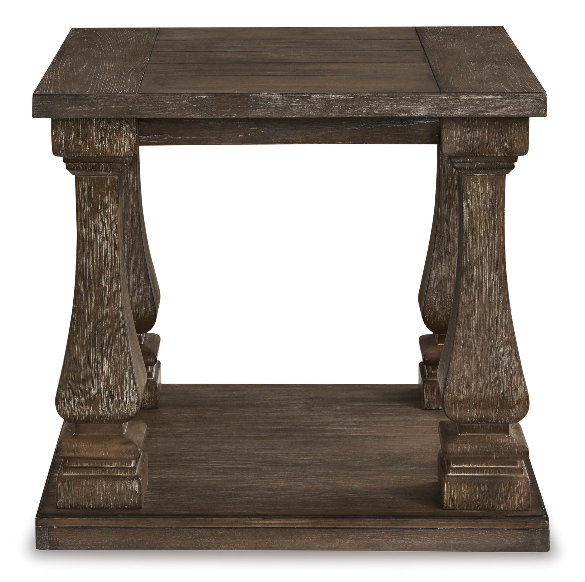 • Homey. Hearty. Heavenly hued. Luring with a distressed weathered gray finish and square baluster legs set on a broad lower shelf for great presence, the Johnelle end table is sure to make your homestead feel that much more like home. The look is beautified with elm veneers and a framed and plank-effect tabletop for a richly crafted masterpiece made for years of satisfaction.