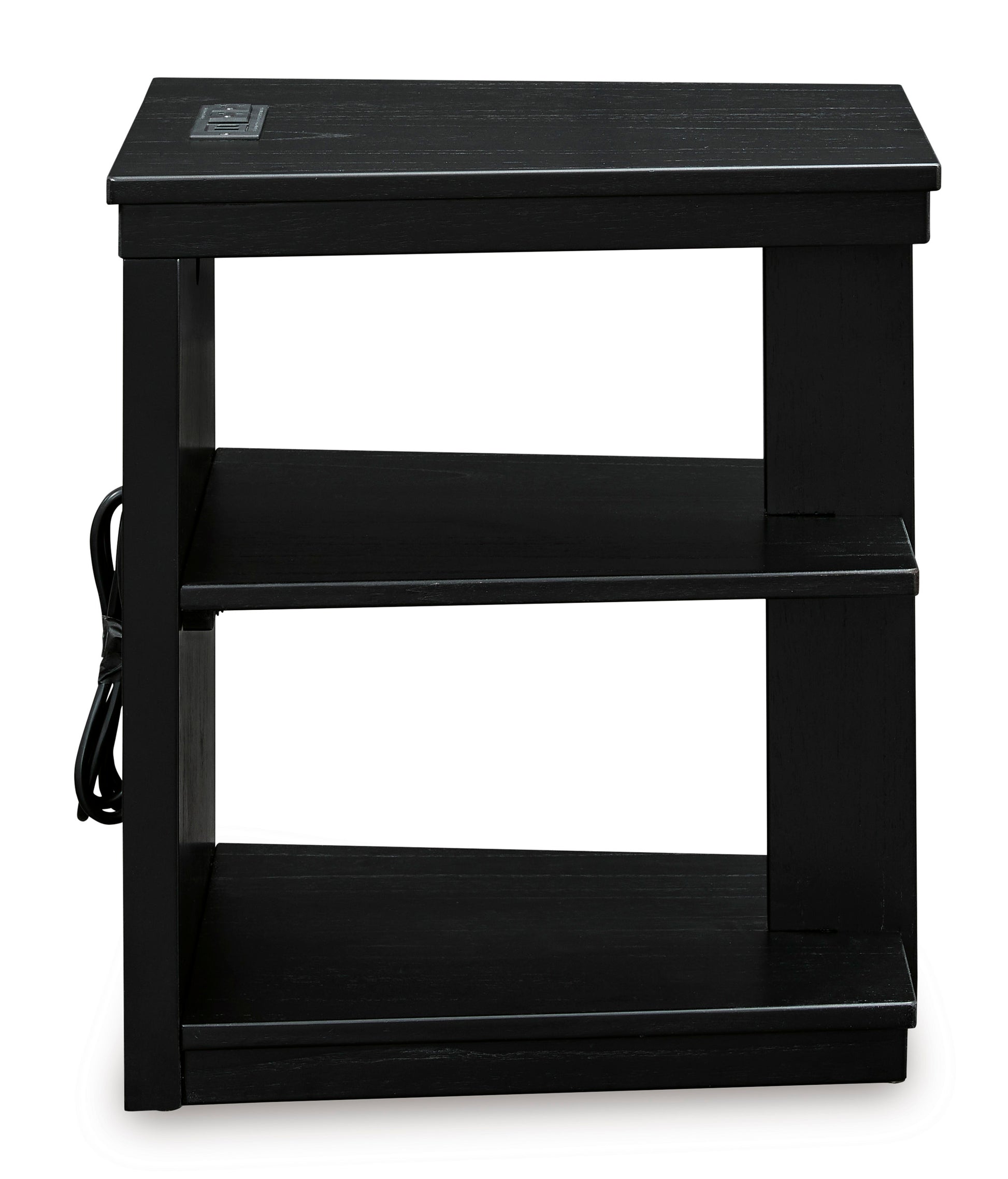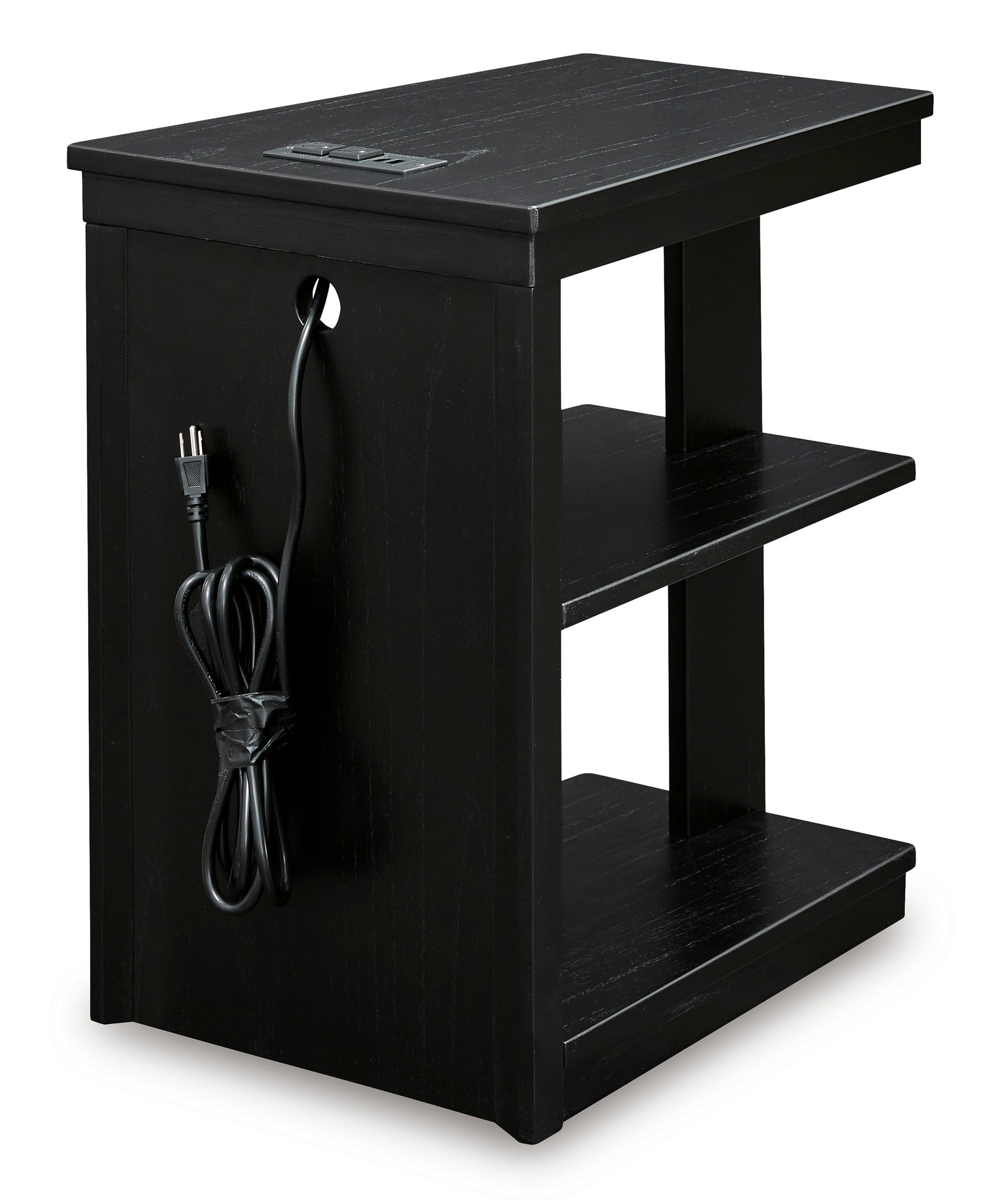 • If you are a lover of simplicity, this chairside end table is the perfect choice. Its black finish, casual contemporary design and spacious storage capacity provide functional style wherever it’s displayed. And with conveniently located USB charging ports, this table keeps up with your high-tech lifestyle.