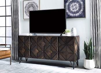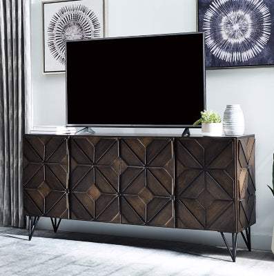 Entertain the possibilities with the Chasinfield extra large TV stand. Proving that furniture can be an art form, this sleek, chic cabinet stand—which accommodates up to 75" TVs—stands out from the crowd with a geometric overlay design that incorporates so much dimension. Adjustable shelving and cutouts for wire management make it highly accommodating. What's more, this TV stand works equally well as a dining room server or entryway console. How's that for staying power?